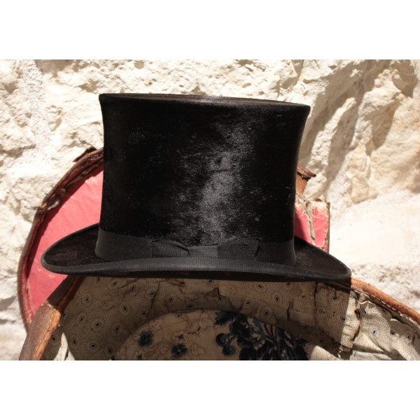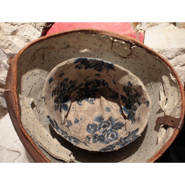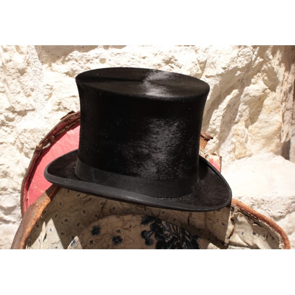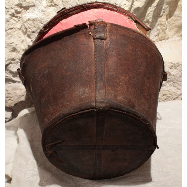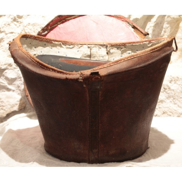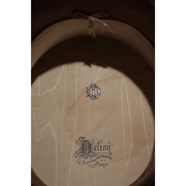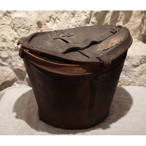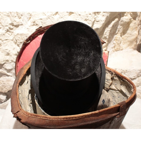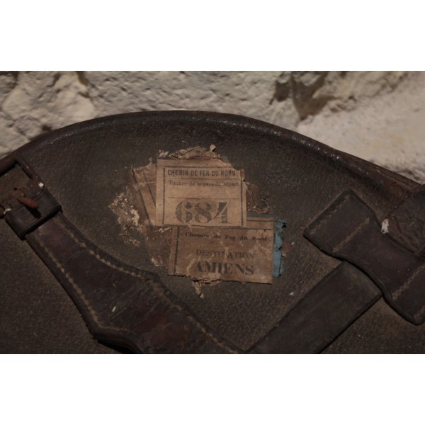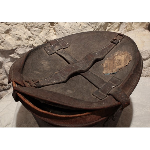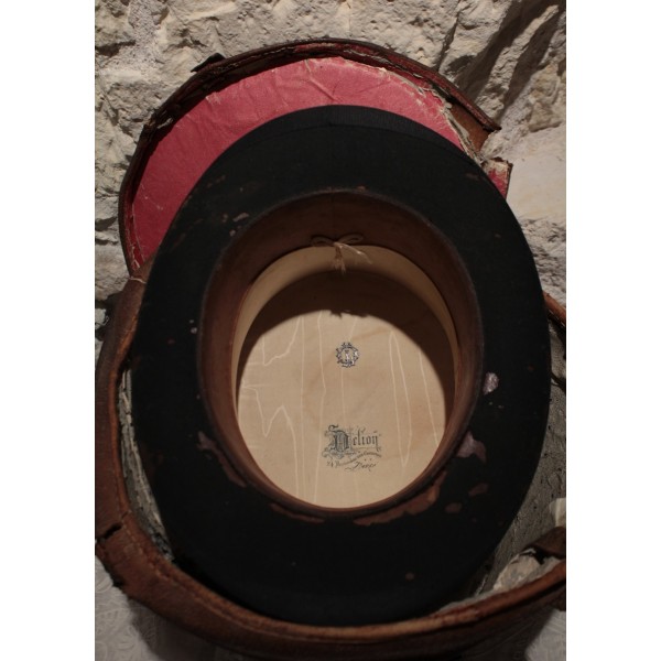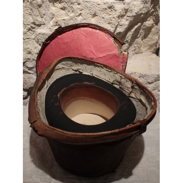 Boîte à chapeau en cuir brun, intérieur gainé de carton et de papier imprimé, sur le dessus de laème siècle. boîte des étiquettes de voyage ferroviaire "Chemin de fer du Nord, destination Amiens". Chapeau haut de forme en taupé noir, intérieur satin "A. Delion, boulevard des Capucins, Paris". Le tout en l'état.