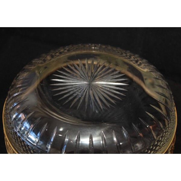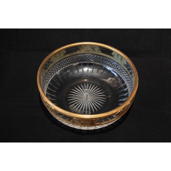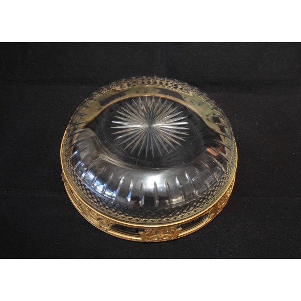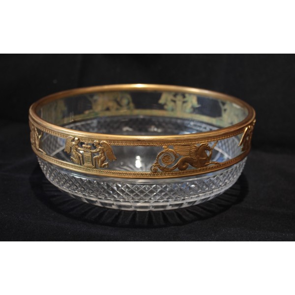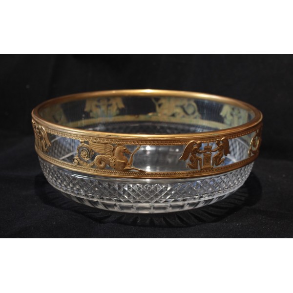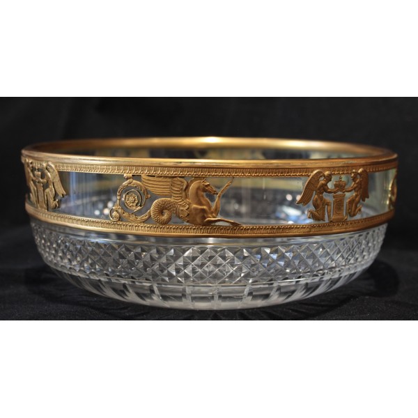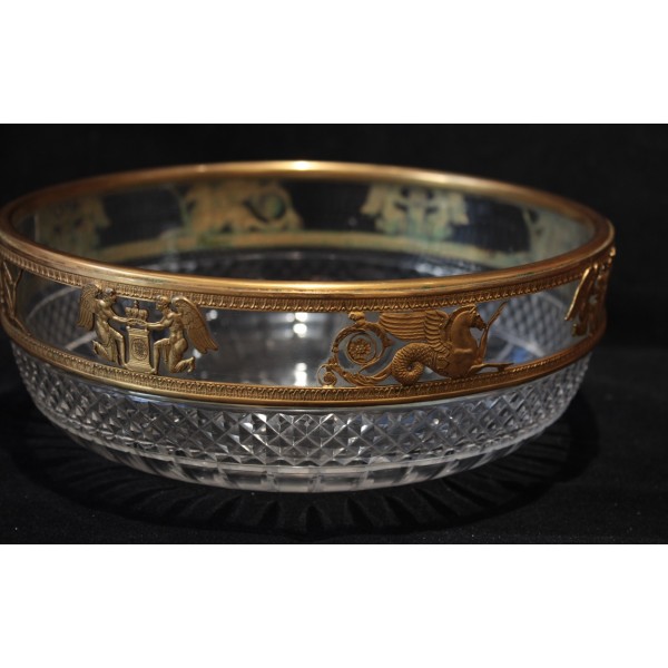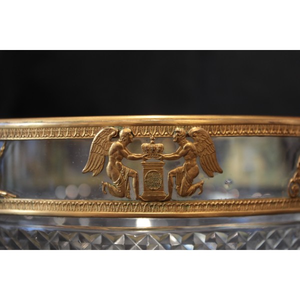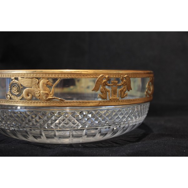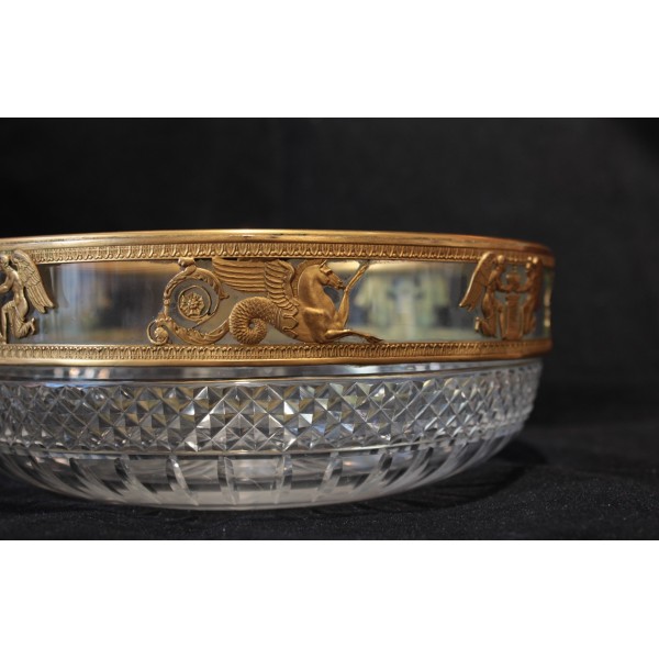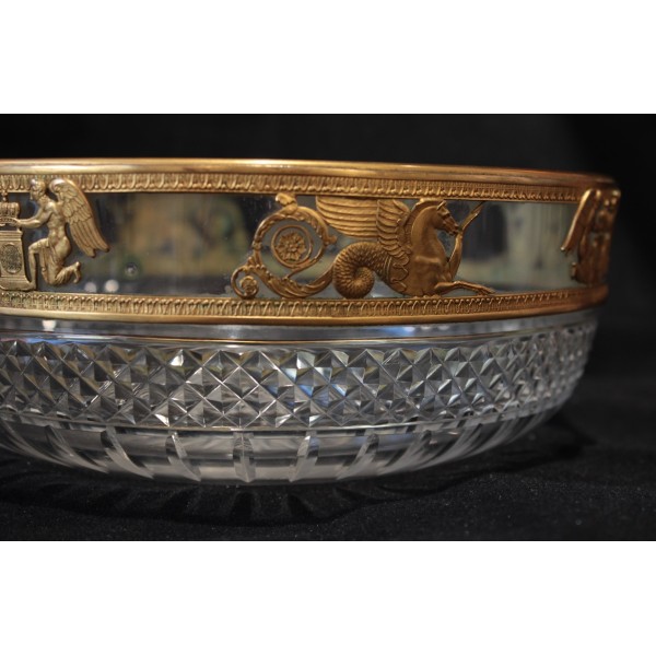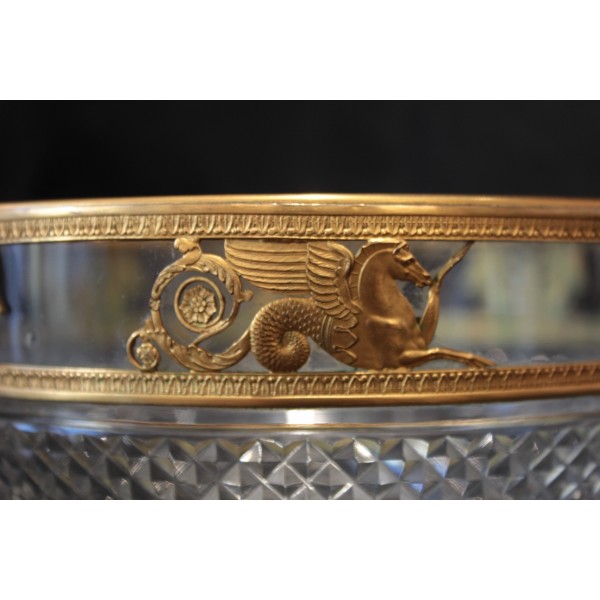 Coupe en cristal taillé pointe de diamant et monture en laiton repoussé figurant des chevaux marins ailés et des génies de la Victoire, allégories mythologique très présentes dans le style Empire. À signaler quelques rayures d'usage sur le fond à l'extérieur.