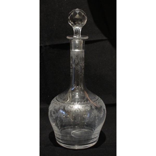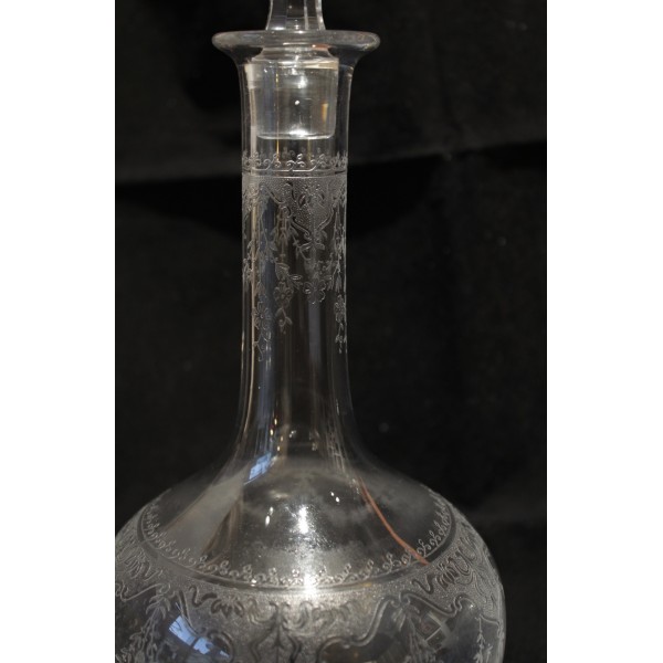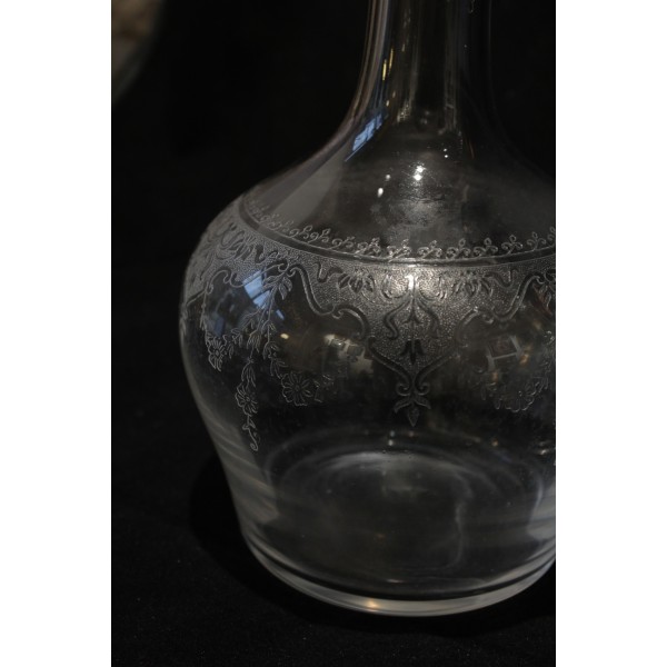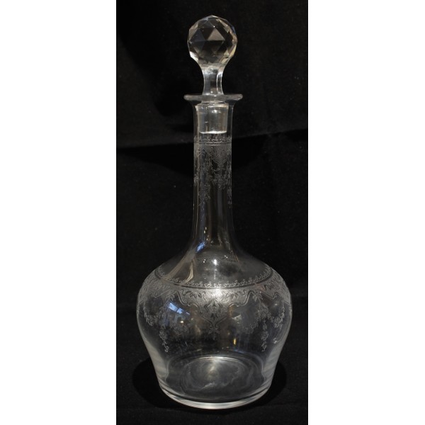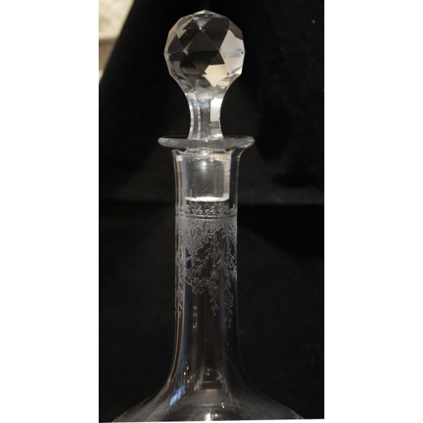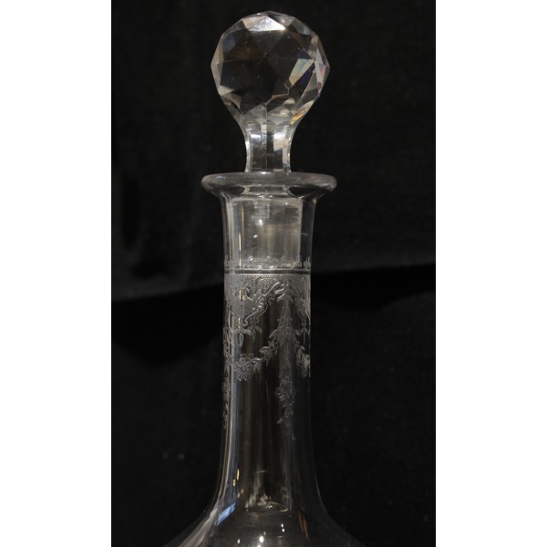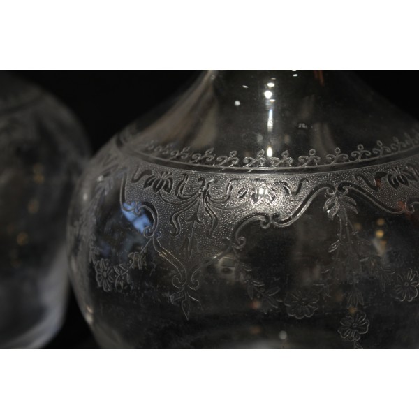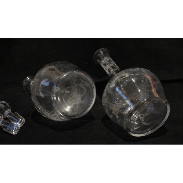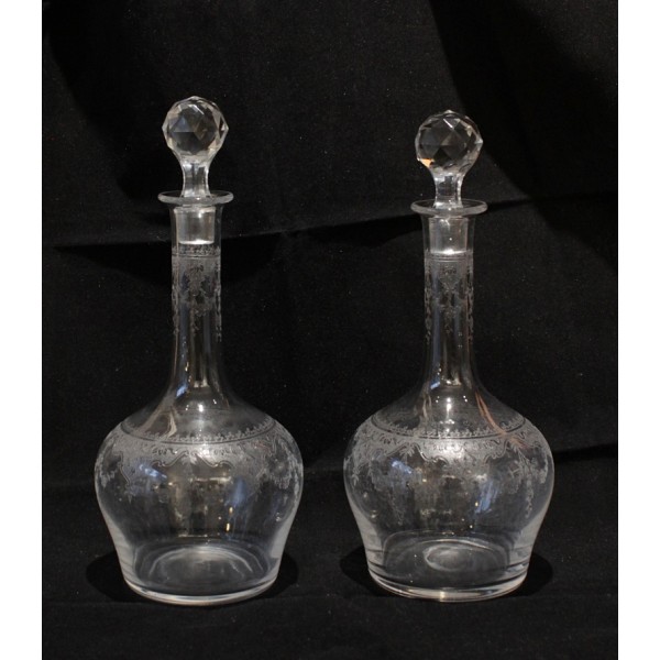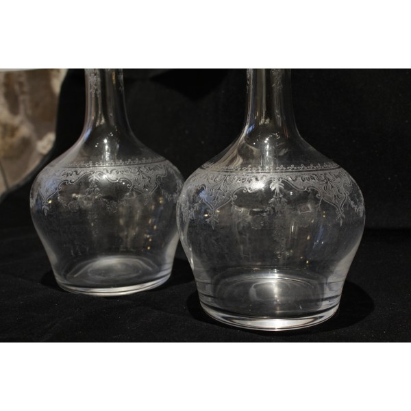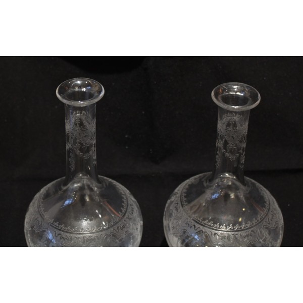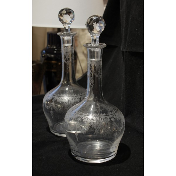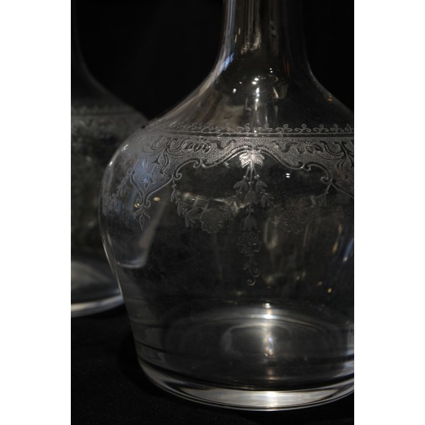 Grande paire de carafes en cristal gravé à décor de guirlandes de fleurs. Bouchons facettés d'origine. Bon état général.