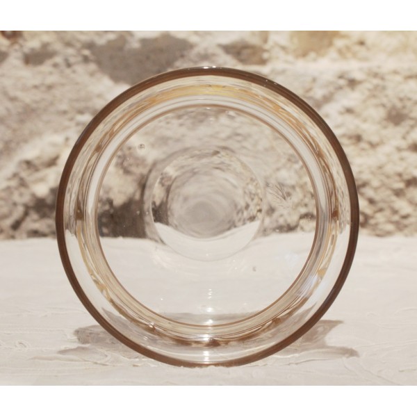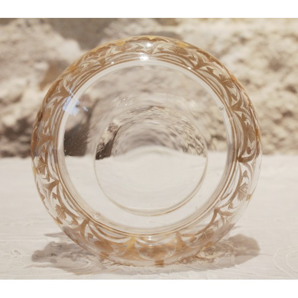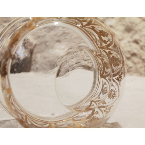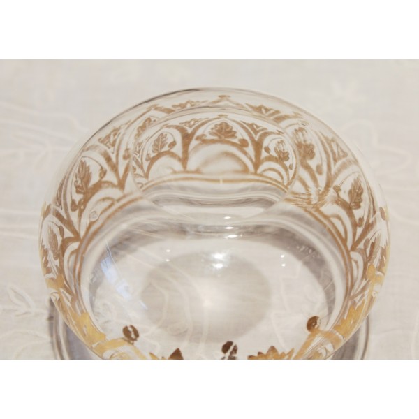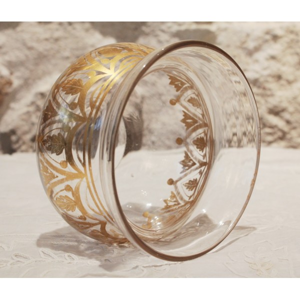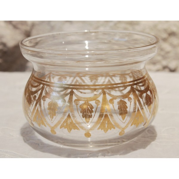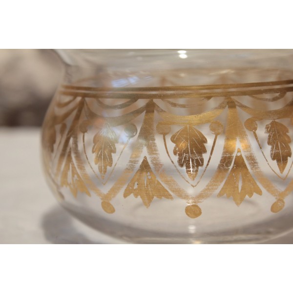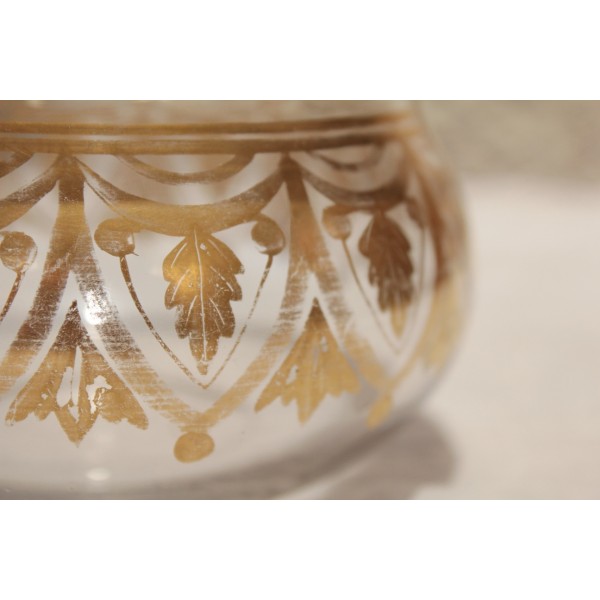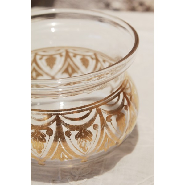 Pot en verre, probablement à confiture, avec décor de feuilles dorées à l'or. Bon état, 2 bulles dans le verre et petites usures de la dorure.