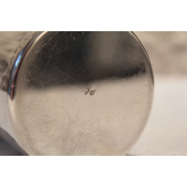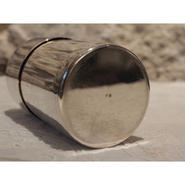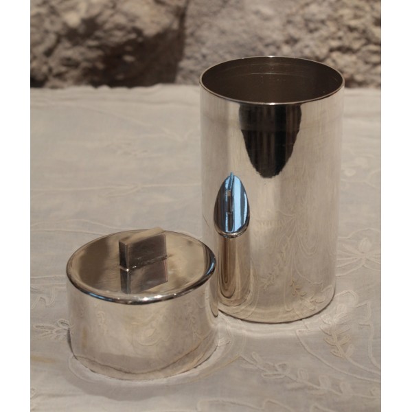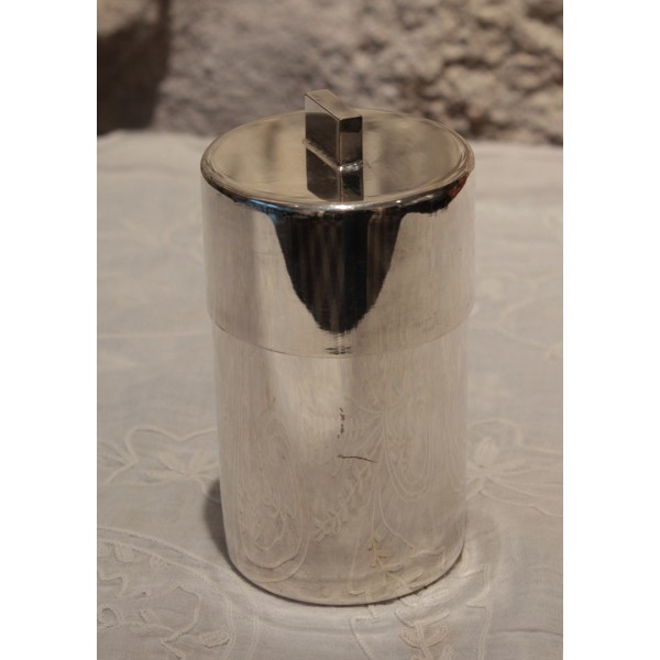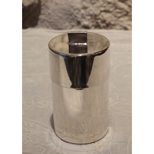 Boîte circulaire en métal argenté possédant son couvercle avec poignée rectangulaire. Poinçon de l'orfèvre "S-D".
