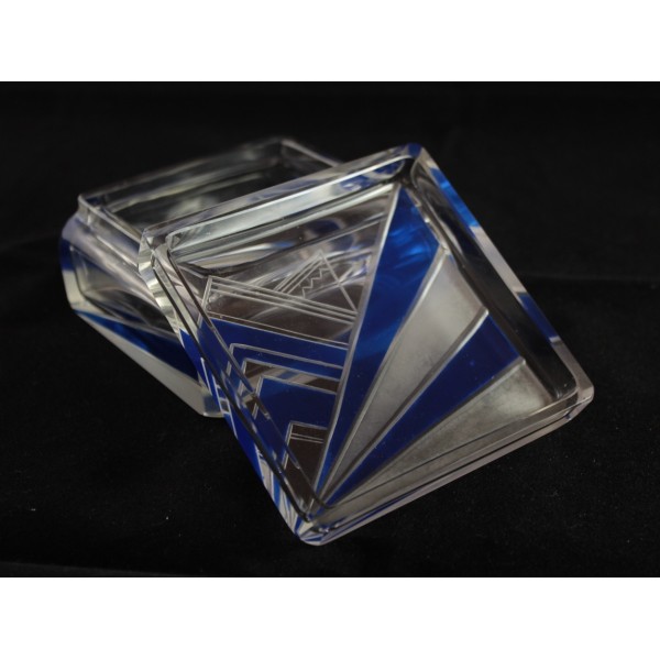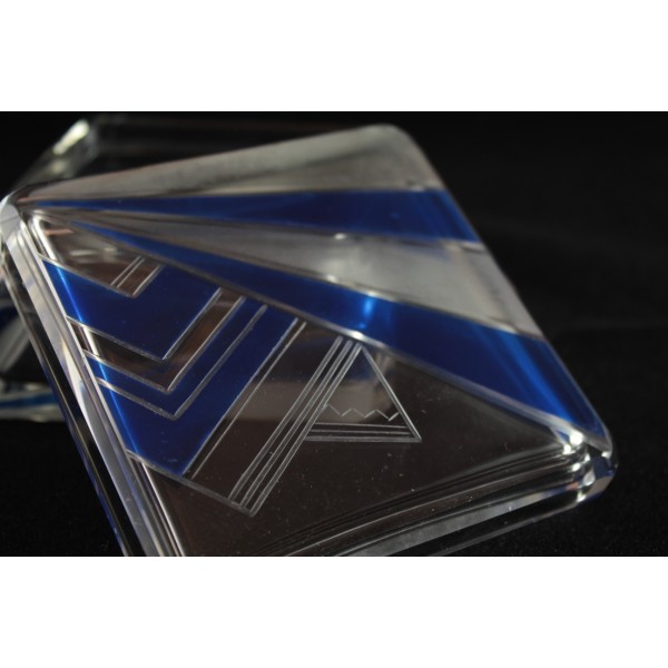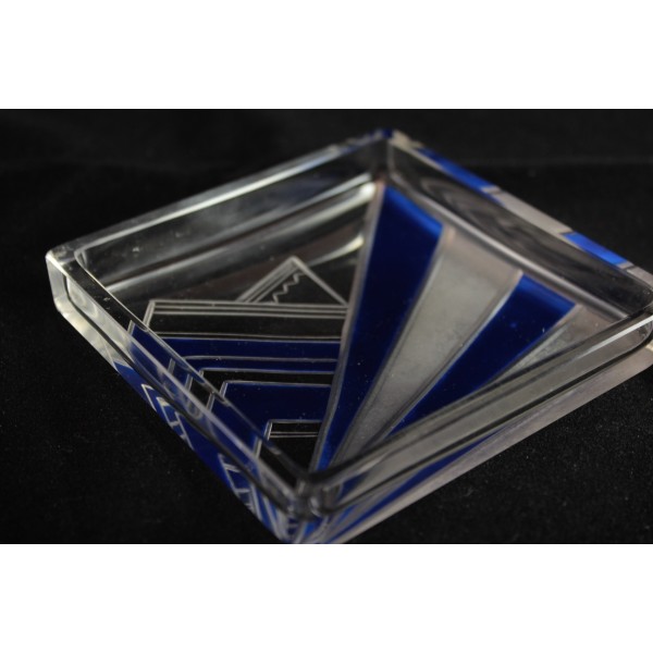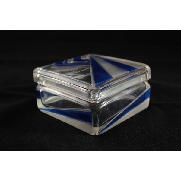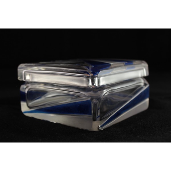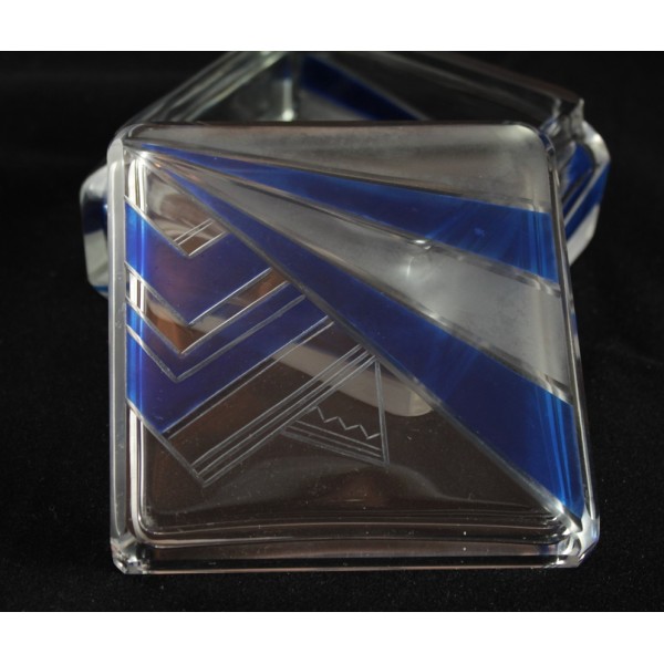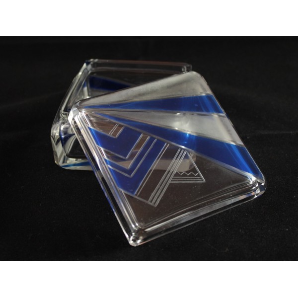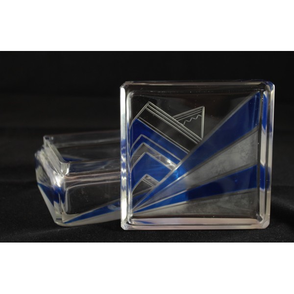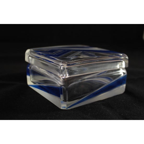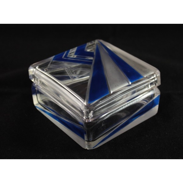 Boîte en verre translucide aux motifs caractéristiques du style Art Déco en dépoli et émail bleu. Bon état général, une infime égrenure sur le couvercle, quelques petites rayures d'usage.