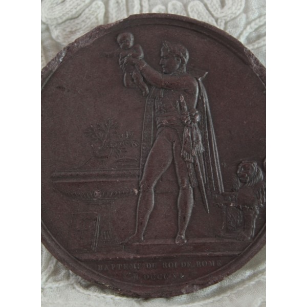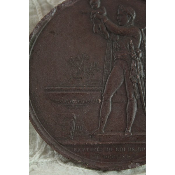 Médaillon commémoratif en plâtre à patine bordeaux représentant le Baptême du Roi de Rome, fils de Napoléon 1er. Andrieu Fecit. En l'état. Réplique exacte de la médaille en bronze conservée au Louvre, voir description ci-dessous.