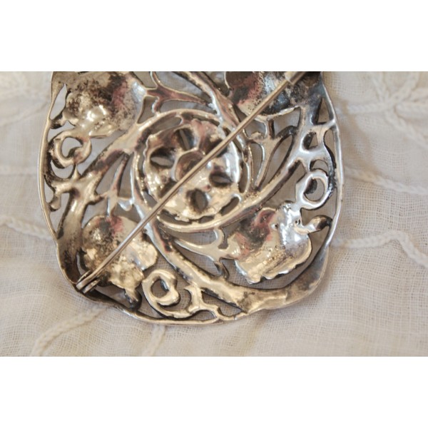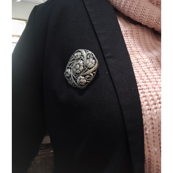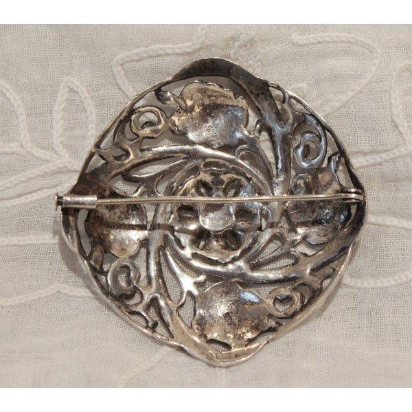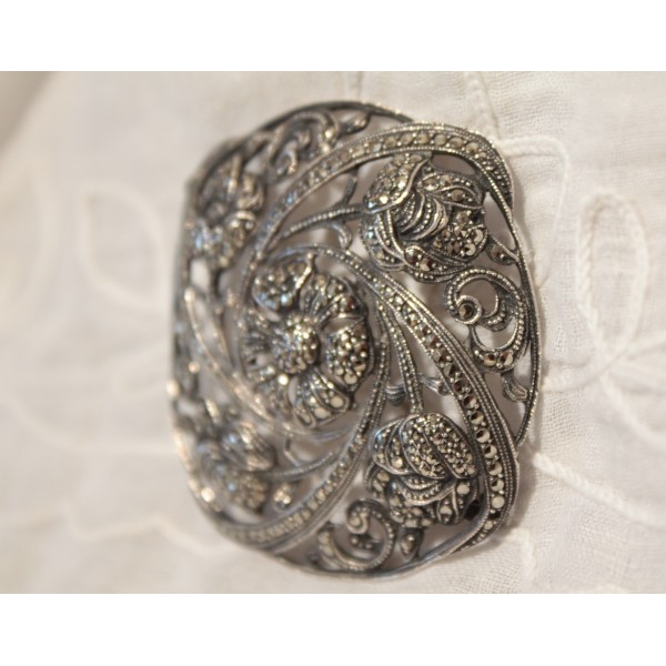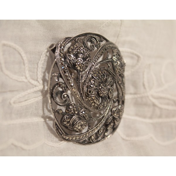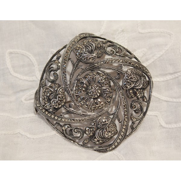 Broche circulaire en argent massif et marcassites. Fin travail de volutes et fleurs stylisées. À signaler 3 petits manques de marcassites. Argent 935 millièmes, 14 grammes brut.