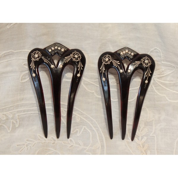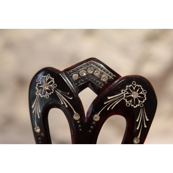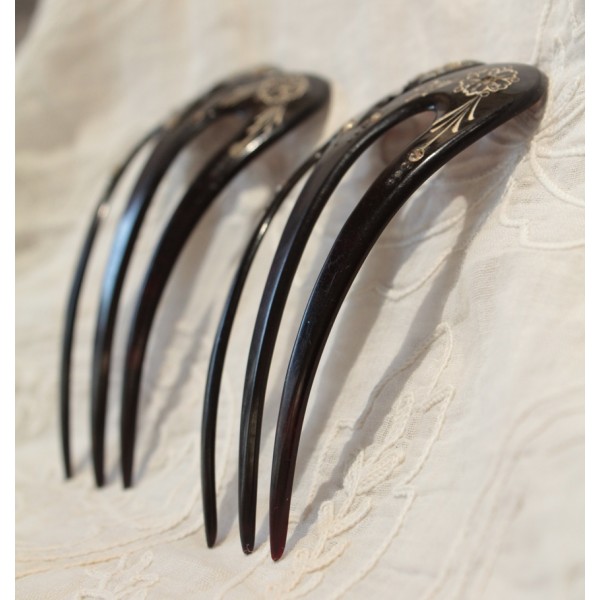 Paire de large peignes en corne brune au décor gravé de fleurs et incrustations de pierre du Rhin. Bon état.