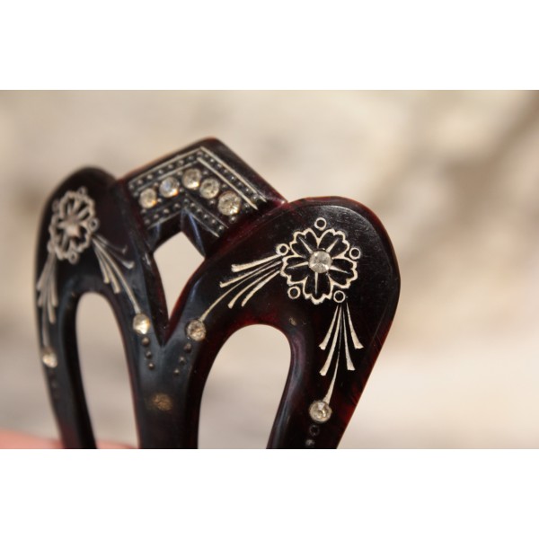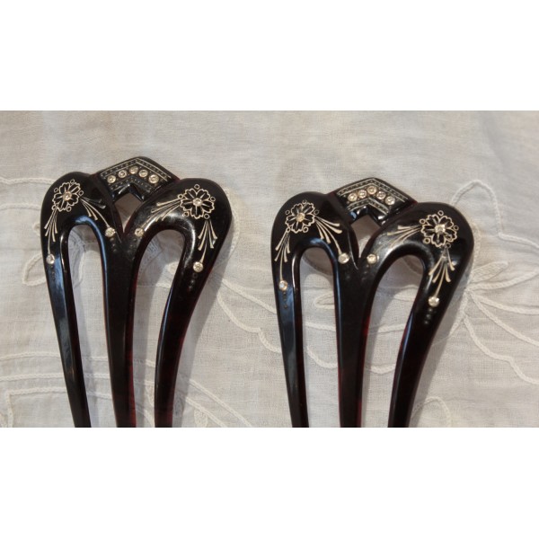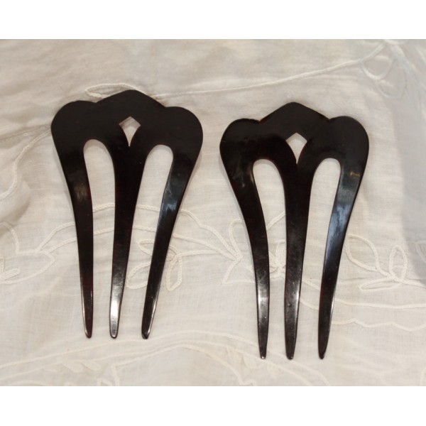 Ces peignes, datant du début du 20ème siècle, étaient utilisés pour maintenir et orner les coiffures des femmes. Portés par paire, ils se glissaient de part et d’autre d’un chignon ou d’une coiffure attachée afin de maintenir les cheveux tout en apportant une touche de raffinement.