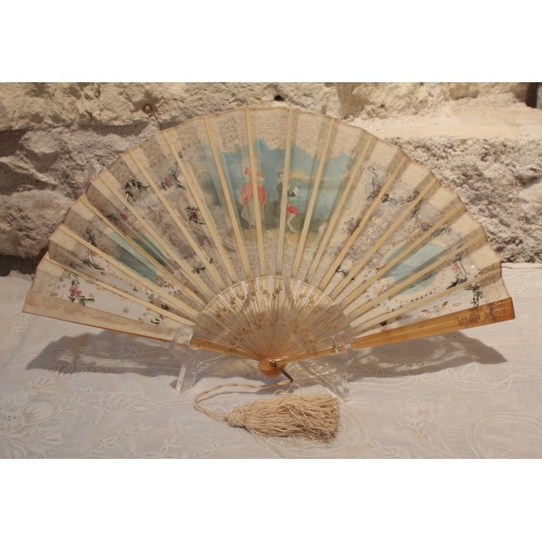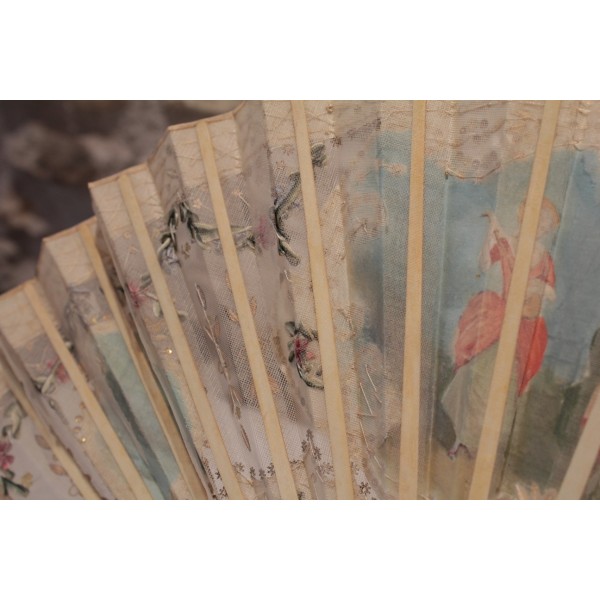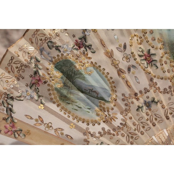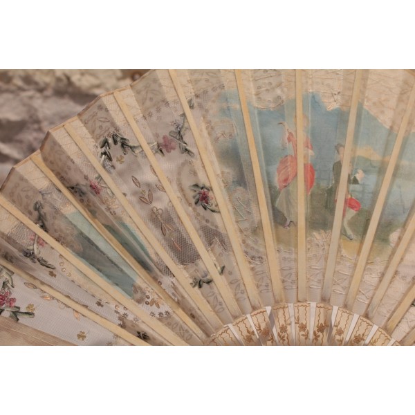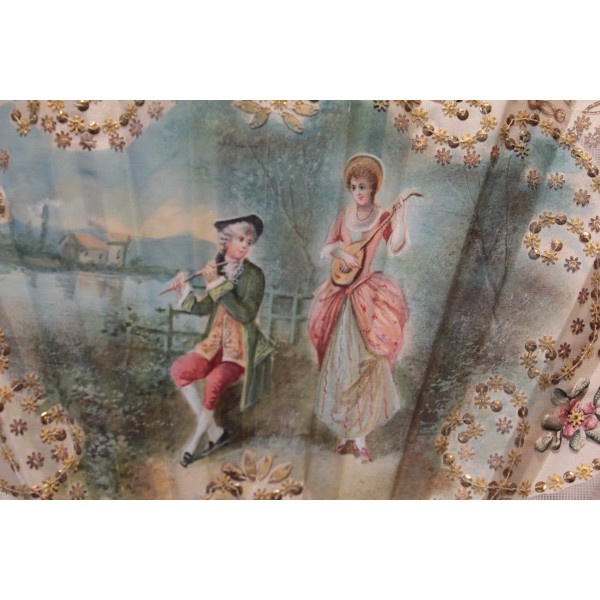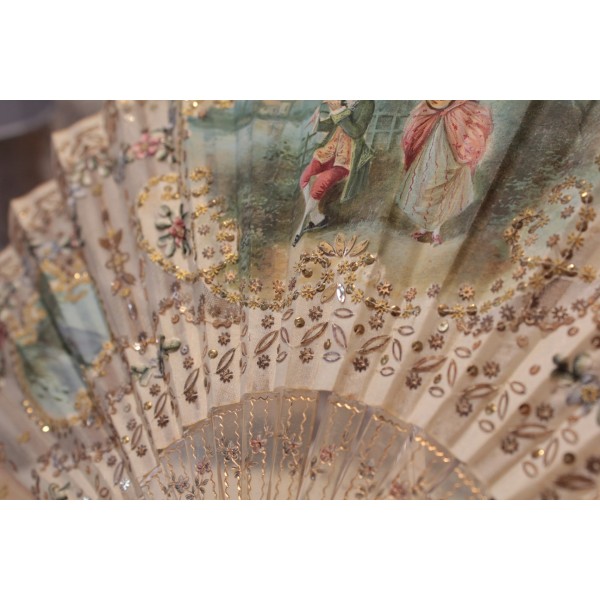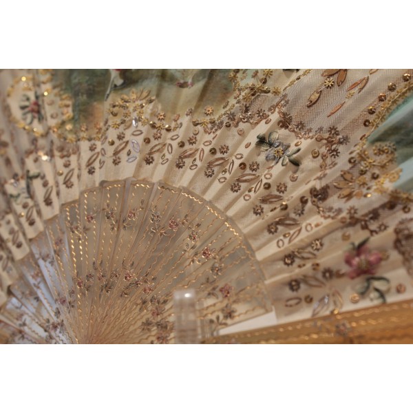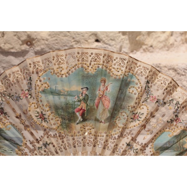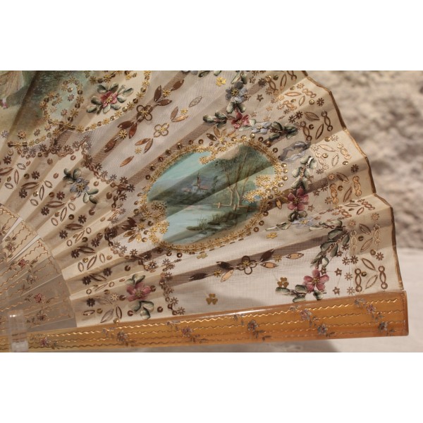 Bel éventail plié à 18 brins. Feuilles en tissu avec scène galante et lacustre peintes dans des cartouches entourées d'un délicat décor de sequins et tissus à décor de fleurs. Monture en corne gravée avec application de dorure et argenture à motif de fleurettes. Flèches en corne, bélière métallique et pompons de passementerie.