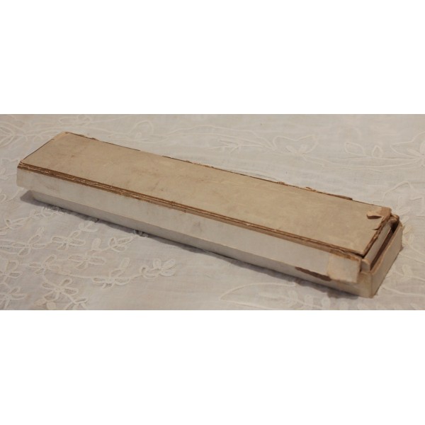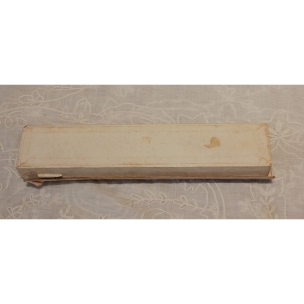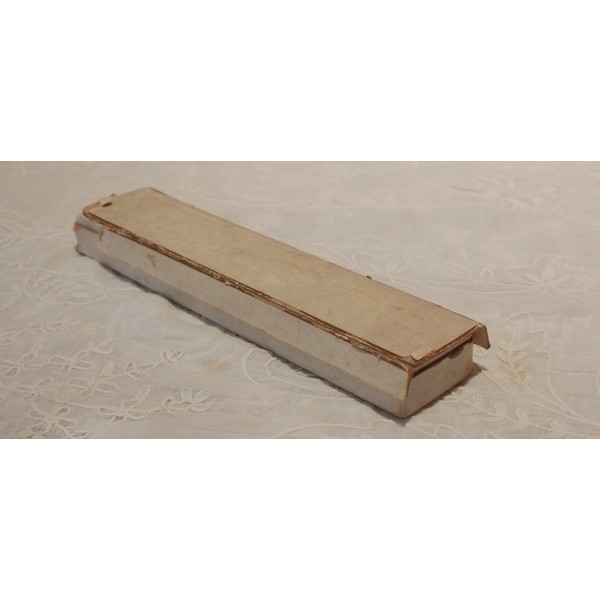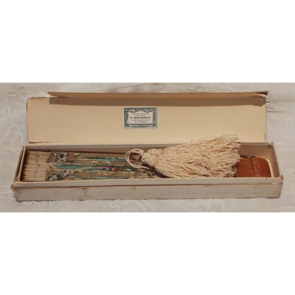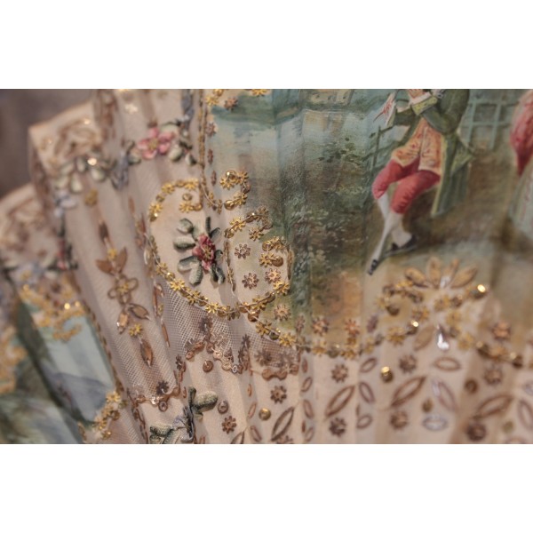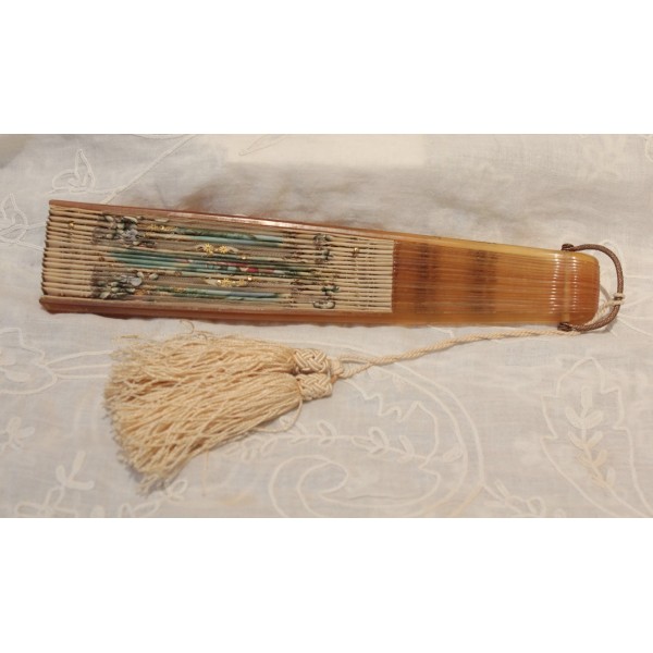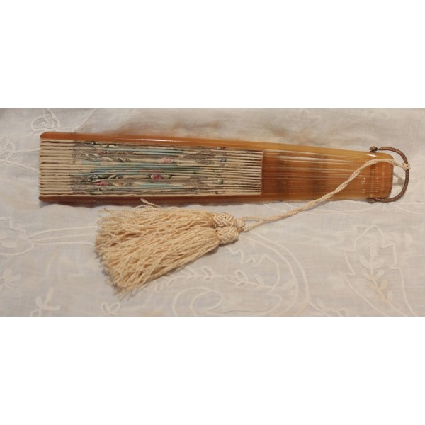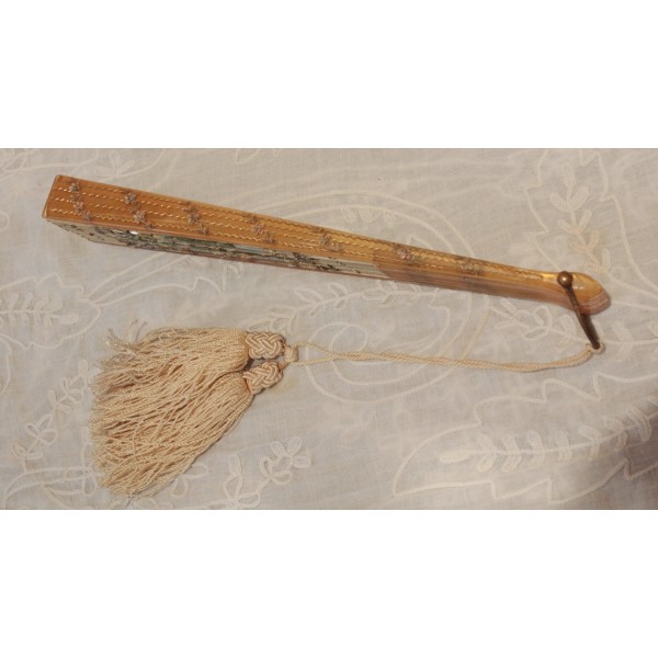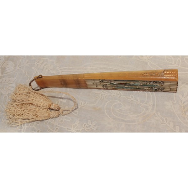 Bel éventail plié à 18 brins. Feuilles en tissu avec scène galante et lacustre peintes dans des cartouches entourées d'un délicat décor de sequins et tissus à décor de fleurs. Monture en corne gravée avec application de dorure et argenture à motif de fleurettes. Flèches en corne, bélière métallique et pompons de passementerie.