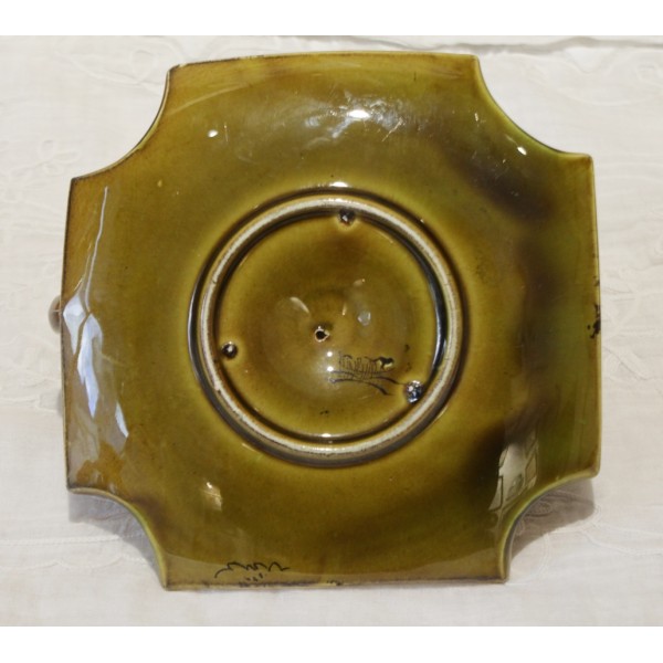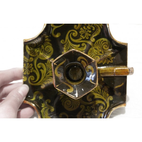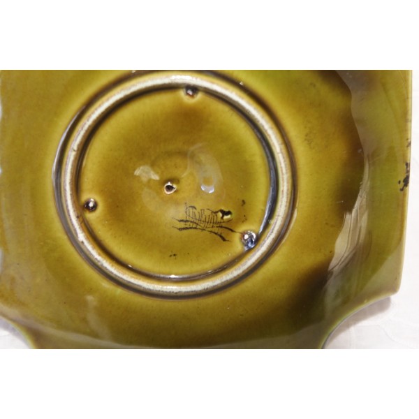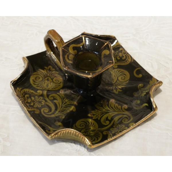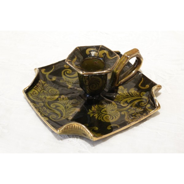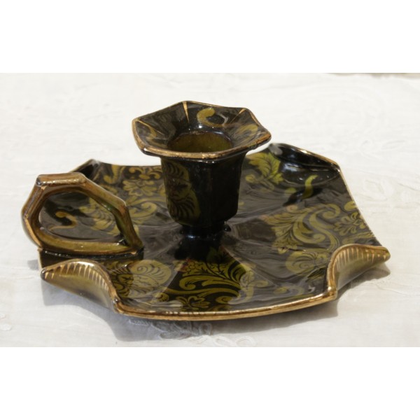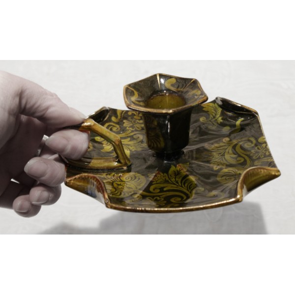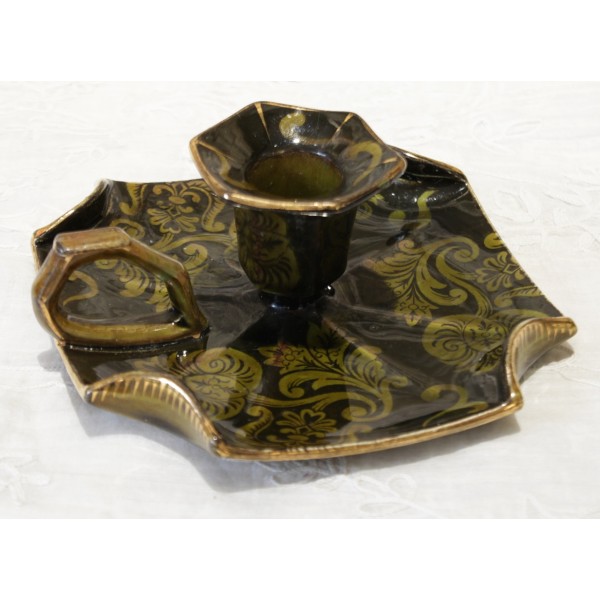 Bougeoir à anse en faïence vert foncé et décor de feuilles stylisées vert clair et dorure. Bon état. Signé Lunéville.
