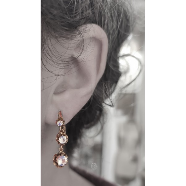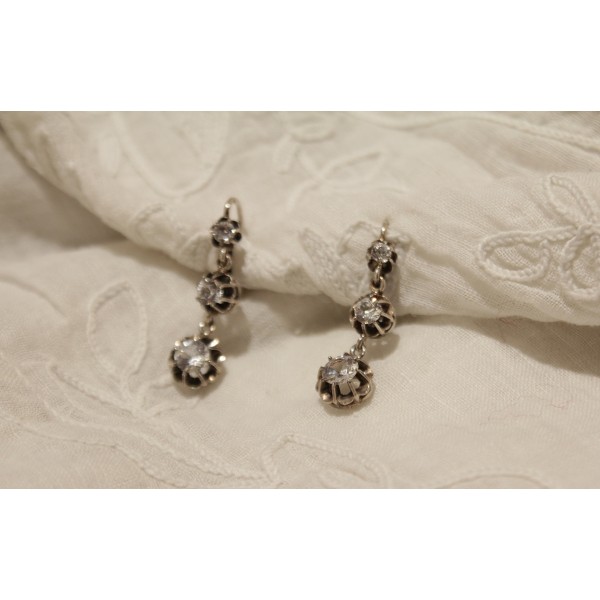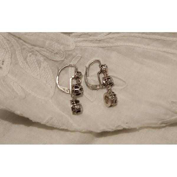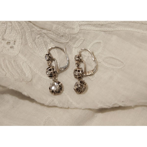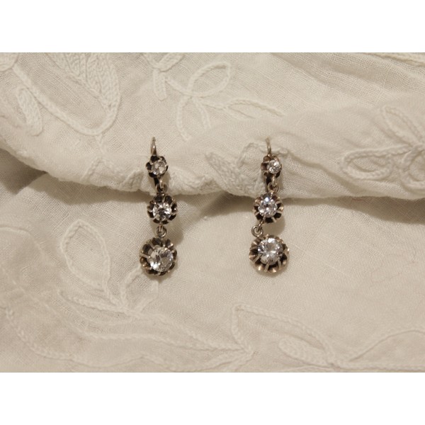 Paire de boucles d'oreilles "dormeuses" serties en griffes de trois pierres blanches, argent 925/1000ème. Poids brut : 4 grammes.