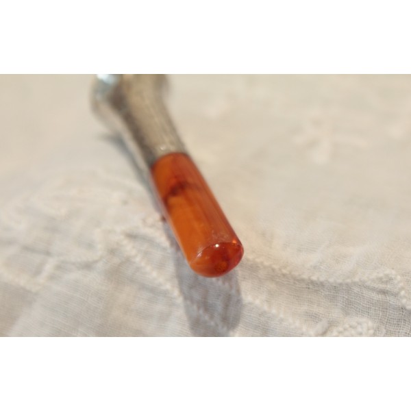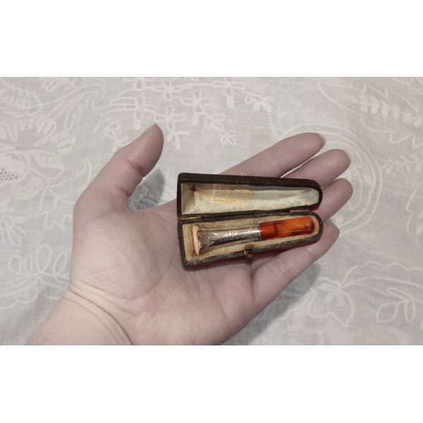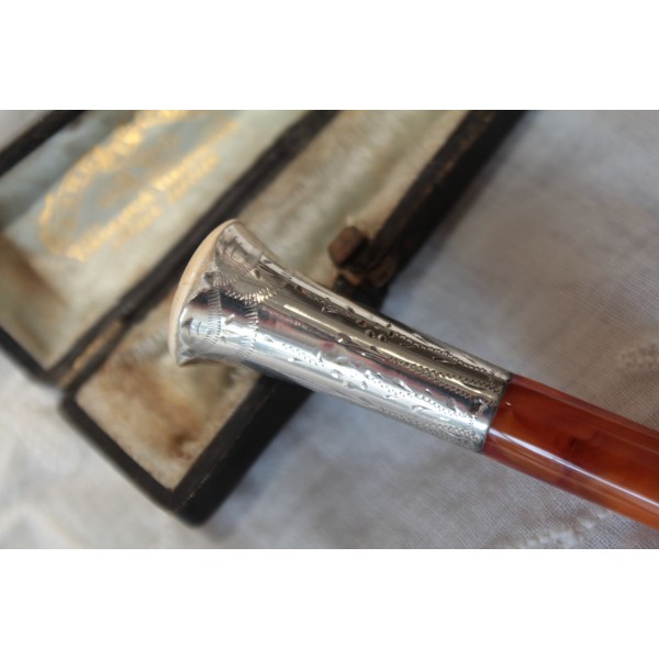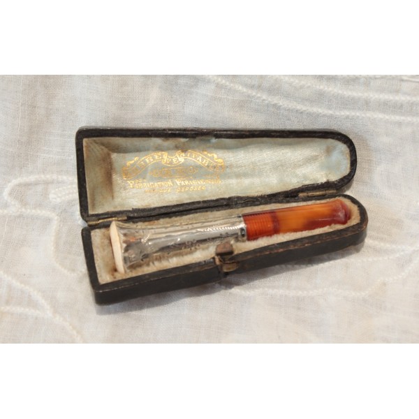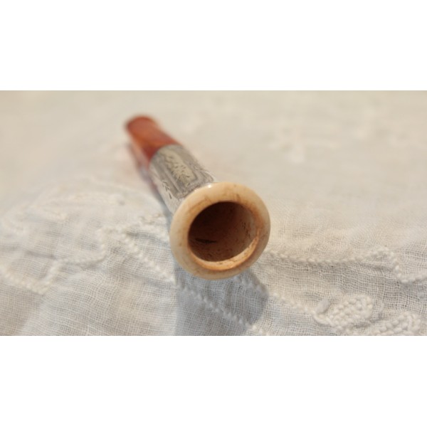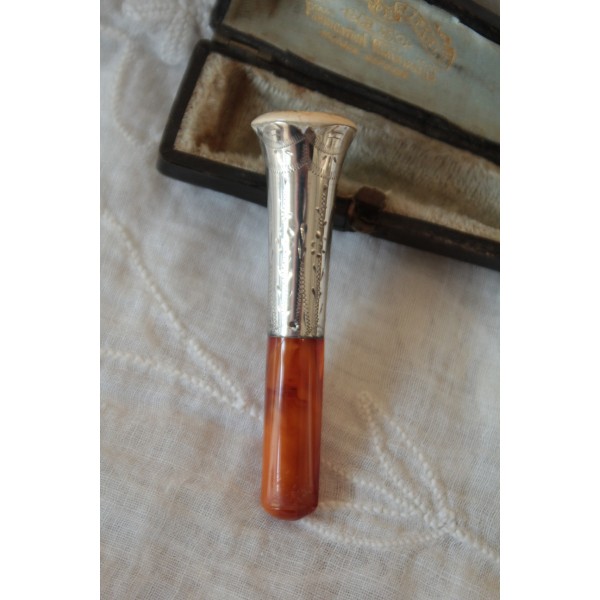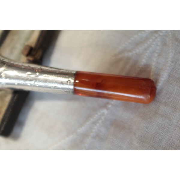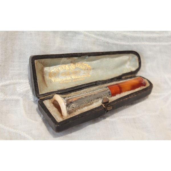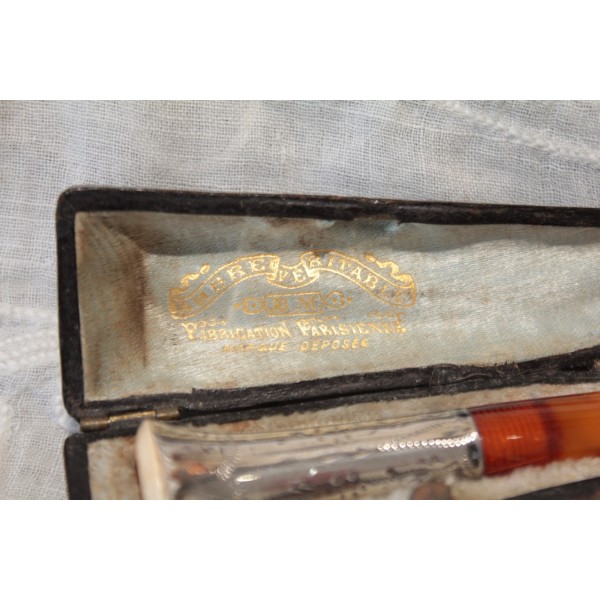Fume cigarette avec un embout en argent massif finement ciselé avec intérieur en terre de pipe et embout en ambre. Étui d'orgine en cuir et intérieur en velours et satin avec inscription "B.M fabrication parisienne, ambre véritable".