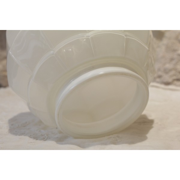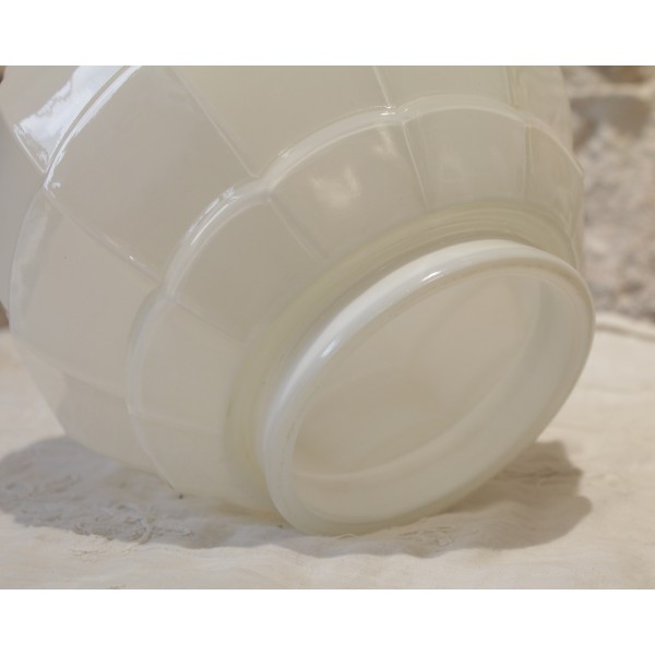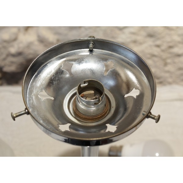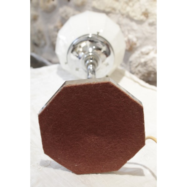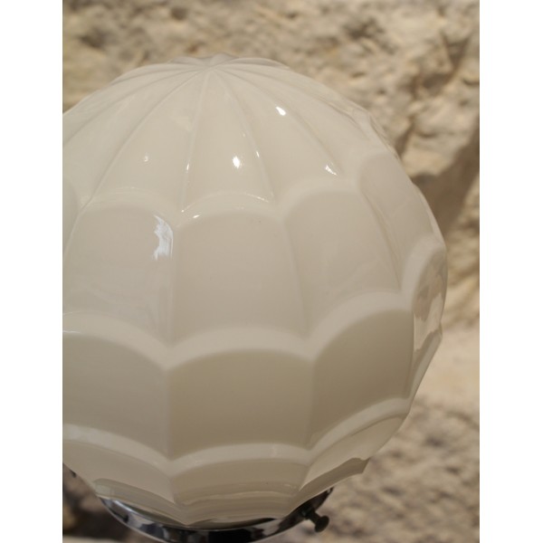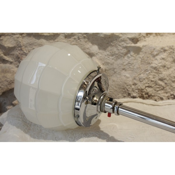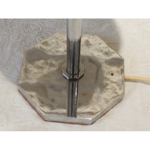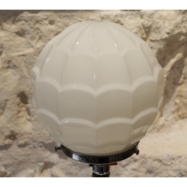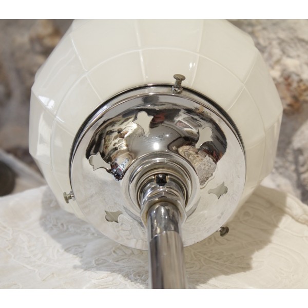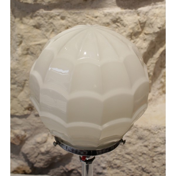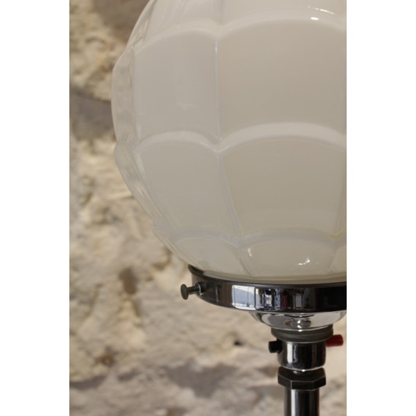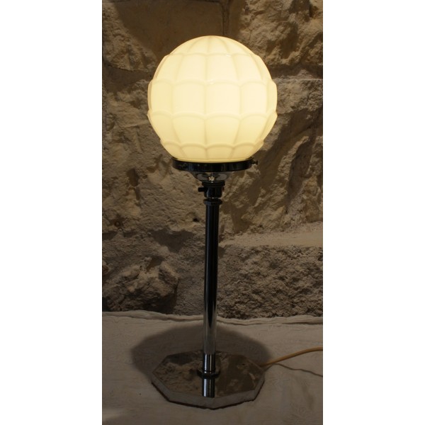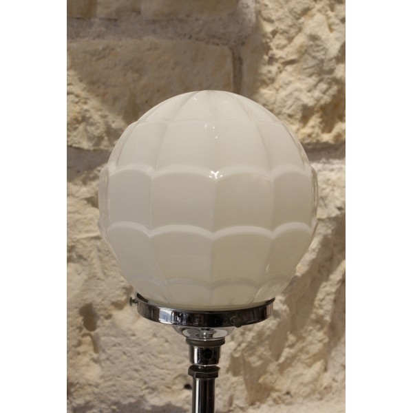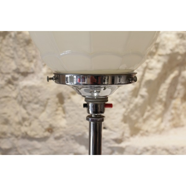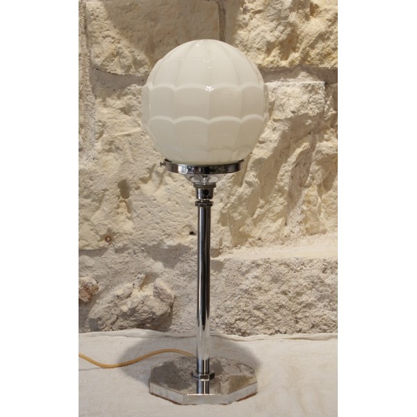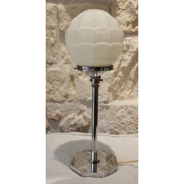 Grande lampe à poser de style Art déco. Piétement en métal chromé avec base octogonale, globe en verre dépoli maintenu à la base par 3 vis. Électricité d'origine et fonctionnelle, bouton poussoir à la base pour allumer et éteindre. Douille B22. Bon état général, à signaler une piqûre sur la base.