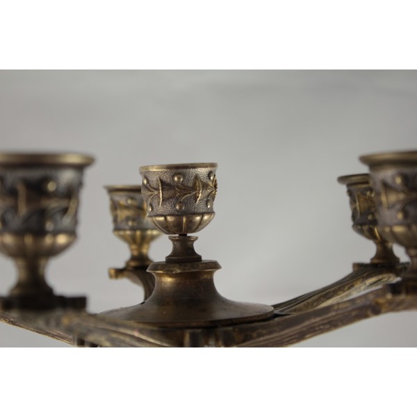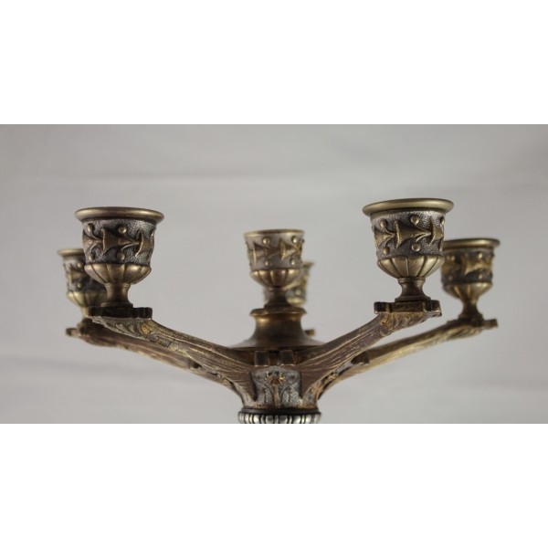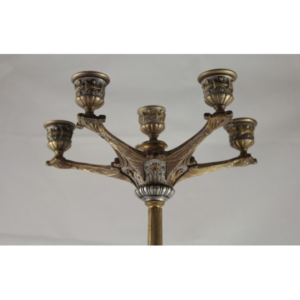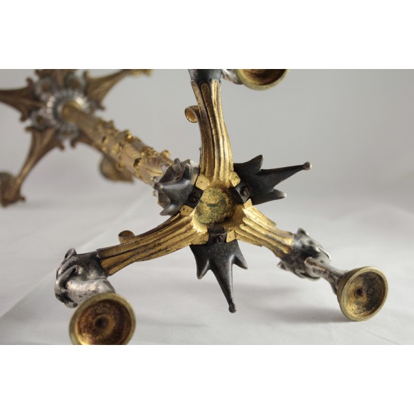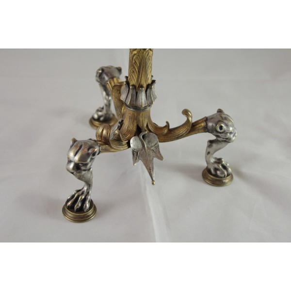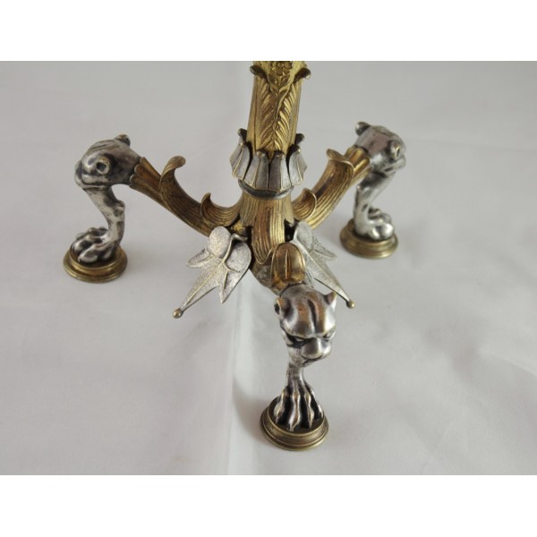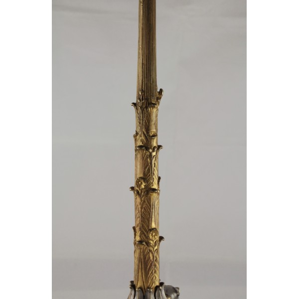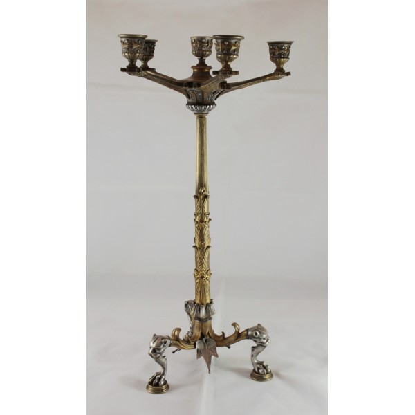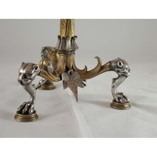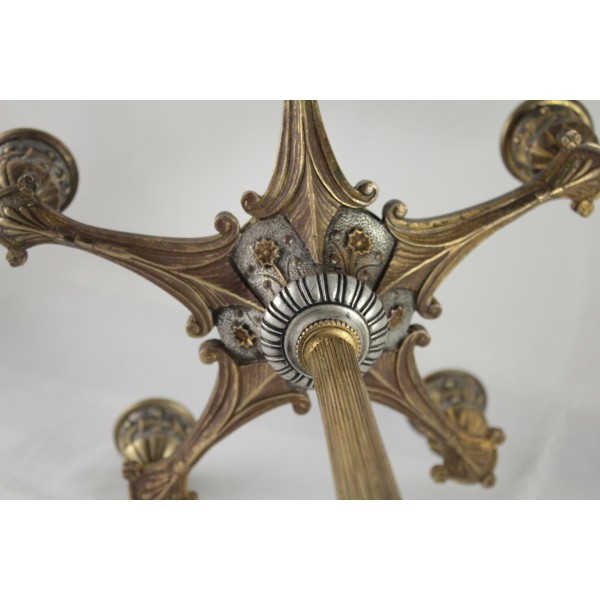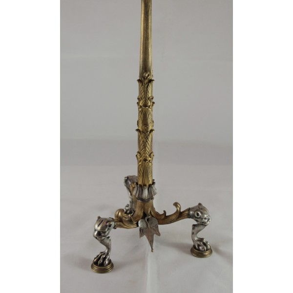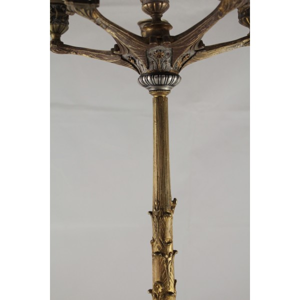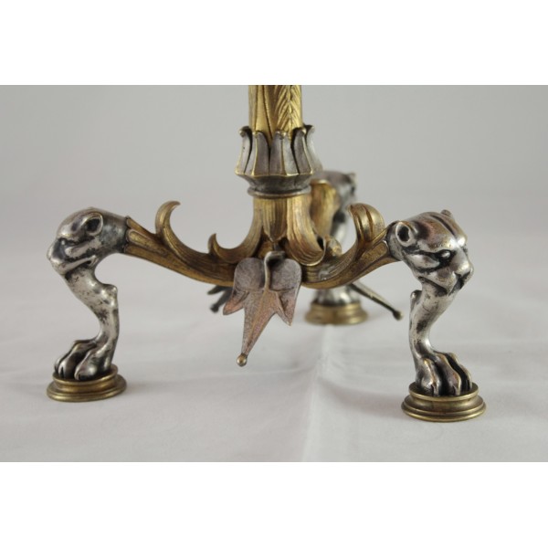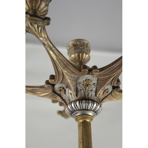 Chandelier à 6 lumières, dont 5 bras, en bronze doré et patine argent reposant sur un fût cannelé à décor de palmettes. Piétement tripode à têtes, pattes de griffons et décor de végétaux. Travail dans le goût de Ferdinand Barbedienne (1810-1892).