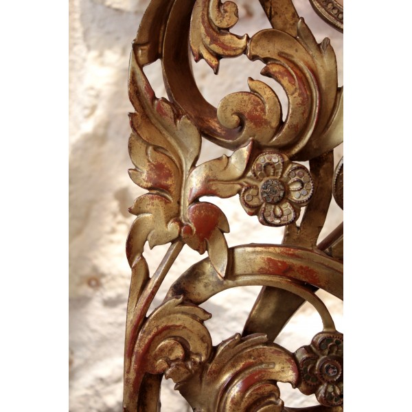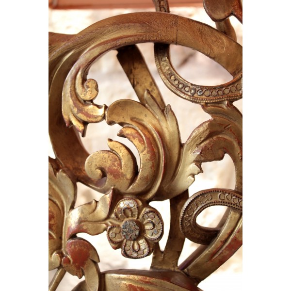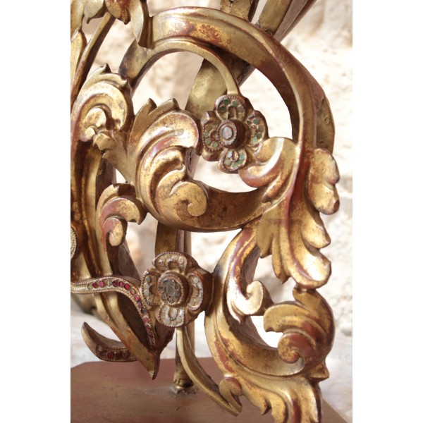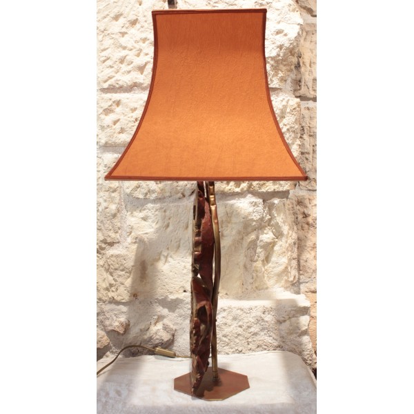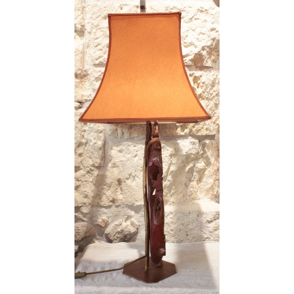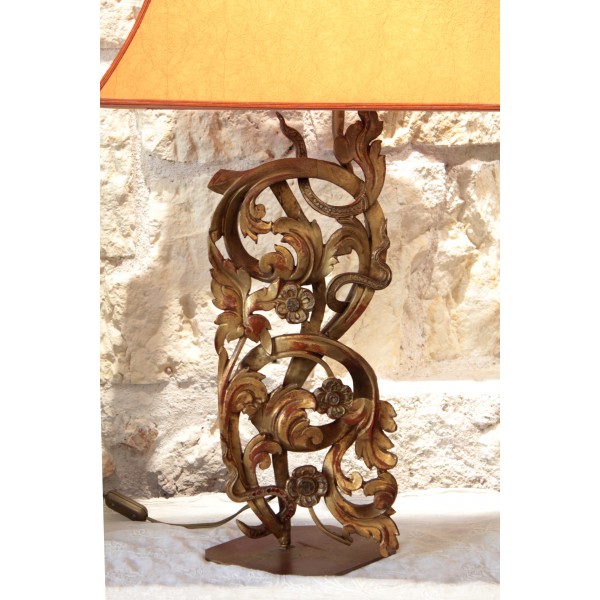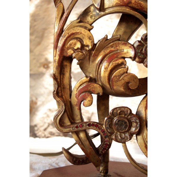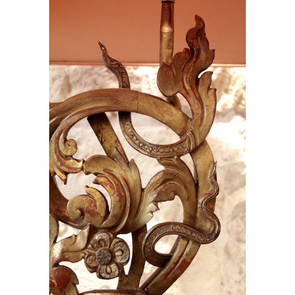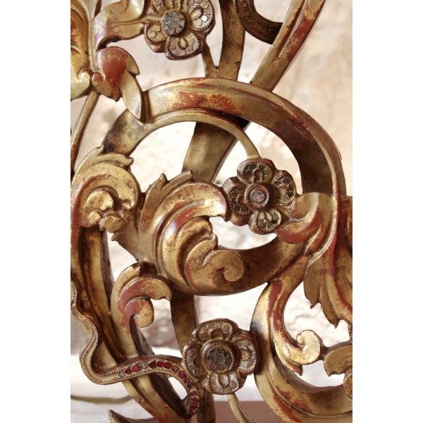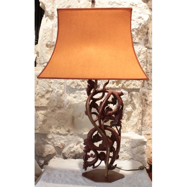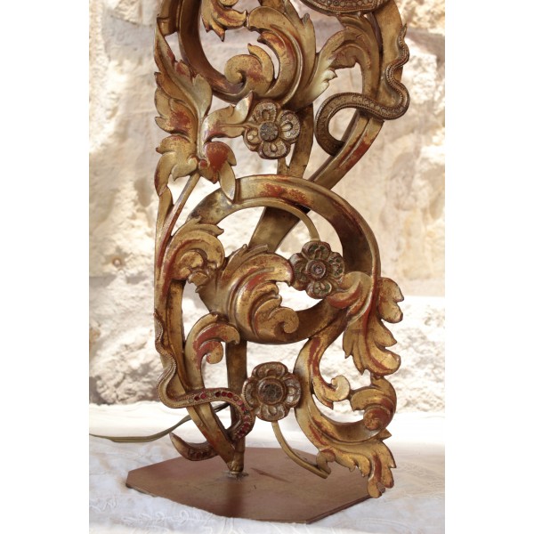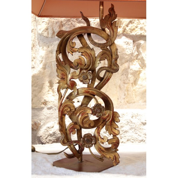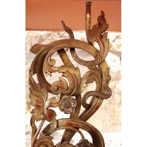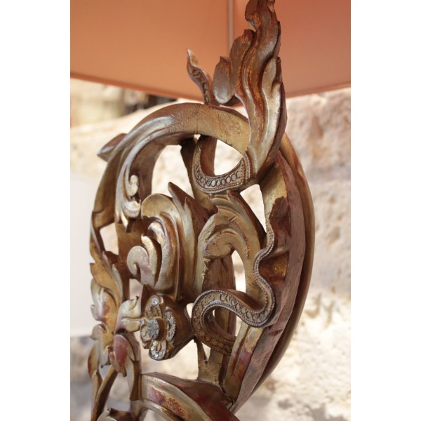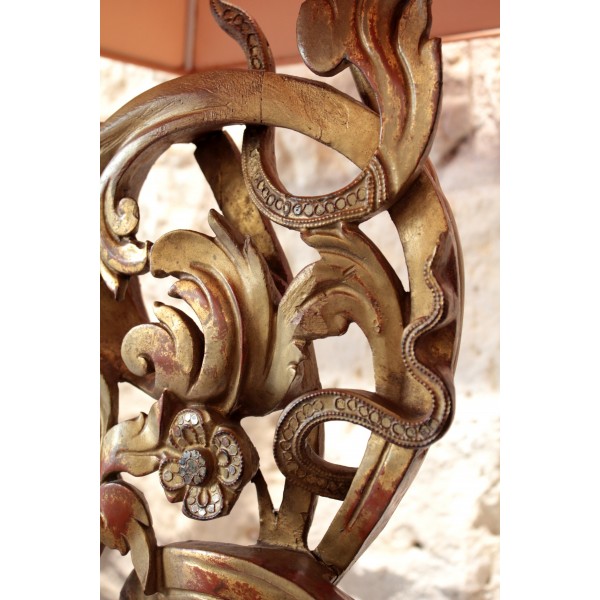 Grande lampe en bois doré et incrustations aux motifs de branches et fleurs stylisés. Large piétement en métal assurant la stabilité. Grand abat-jour en tissu orange froissé. Électricité révisée, douille E27.