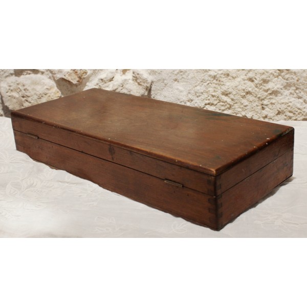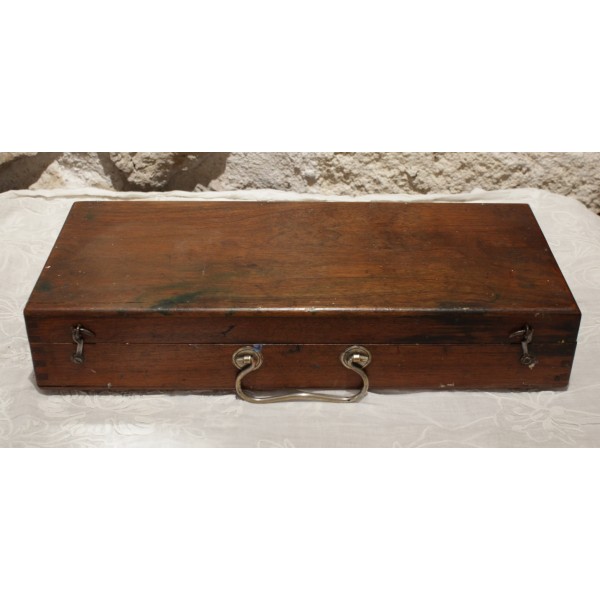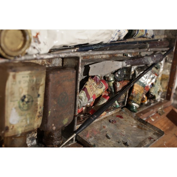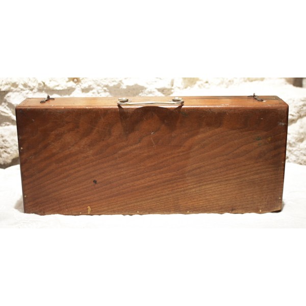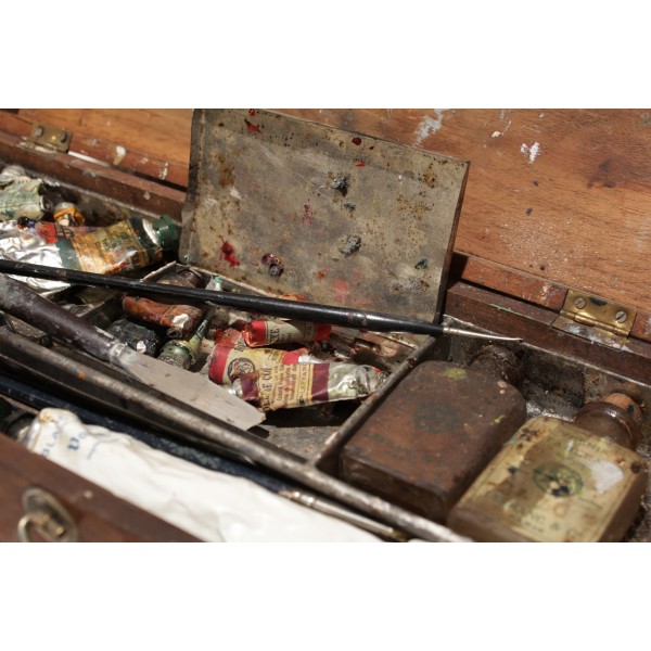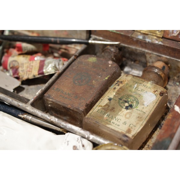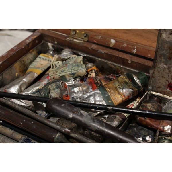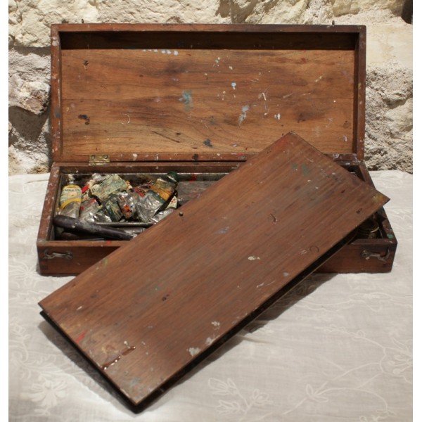 Boîte en bois contenant tout le nécessaire de peinture à l'huile, dont une palette, 17 tubes Lefranc (Lefranc Bourgeois), 2 flacons, 1 pot de dorure, 3 pinceaux, 2 couteaux de peinture et 1 crayon. En l'état.
