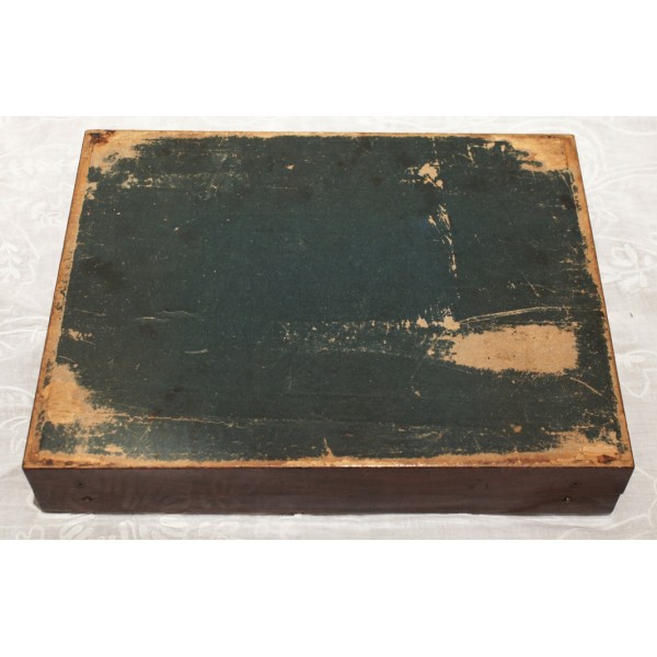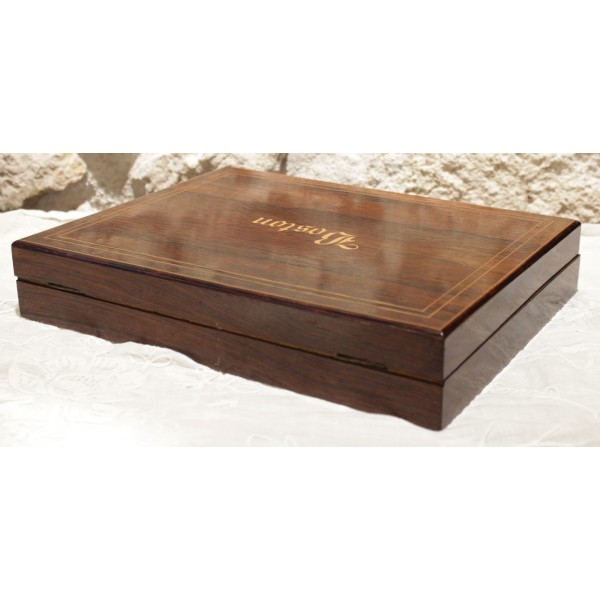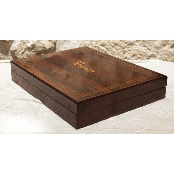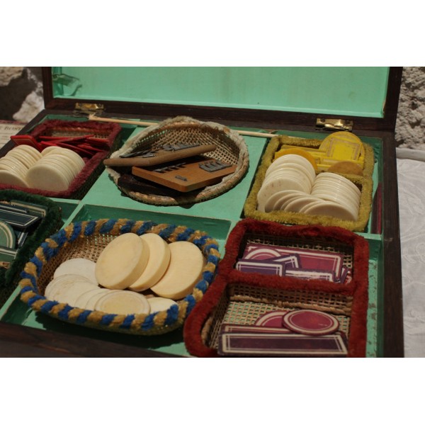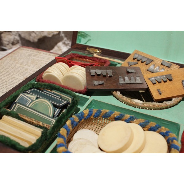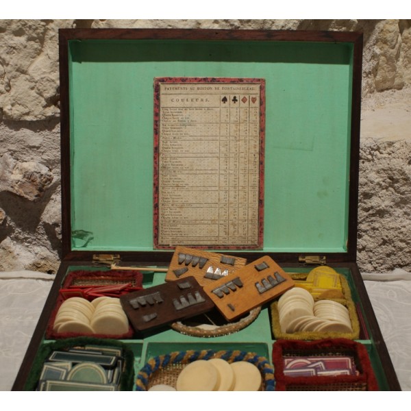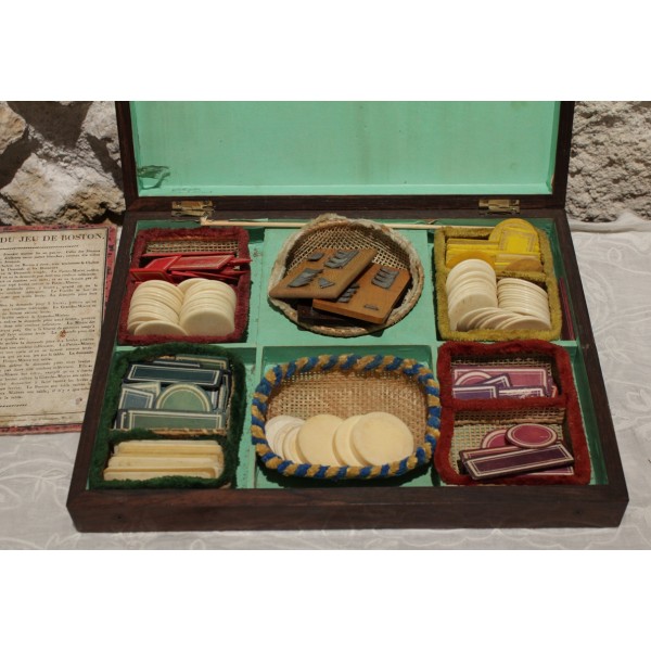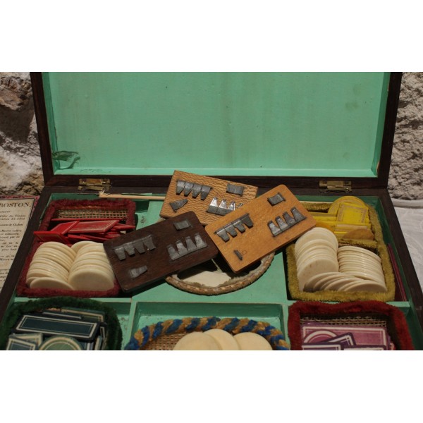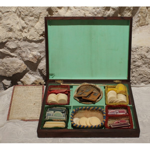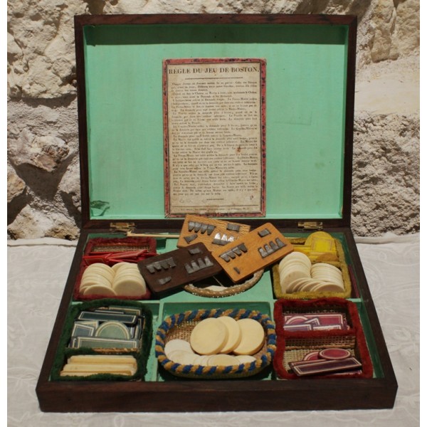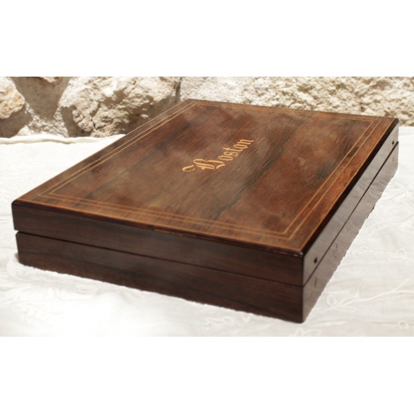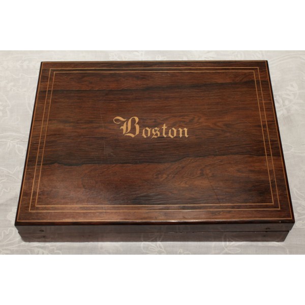 Boîte en palissandre et marqueterie de buis "Boston" contenant des paniers avec jetons en os, compte points et règles du jeu (voir description ci-dessous). Manque système de fermeture du coffret.