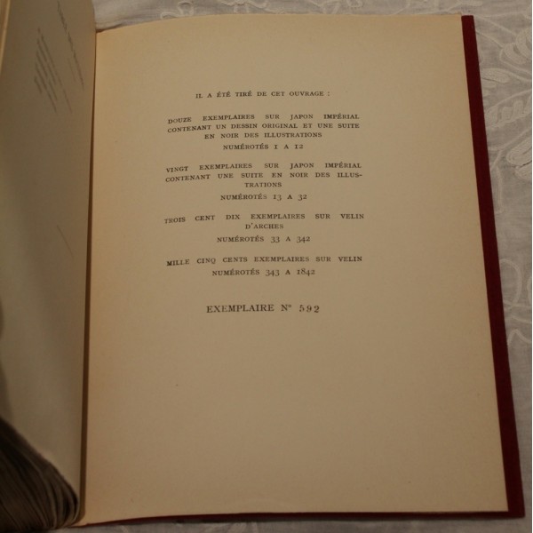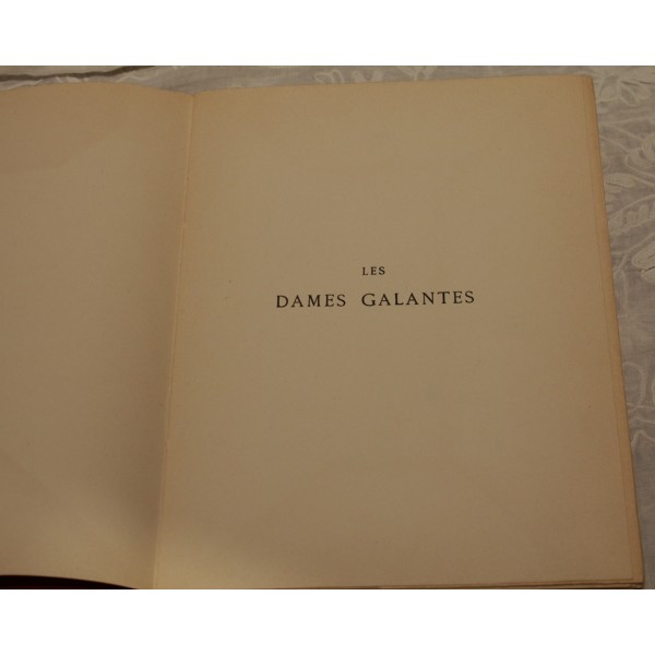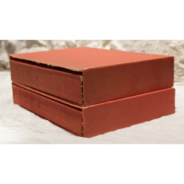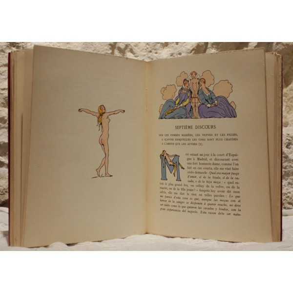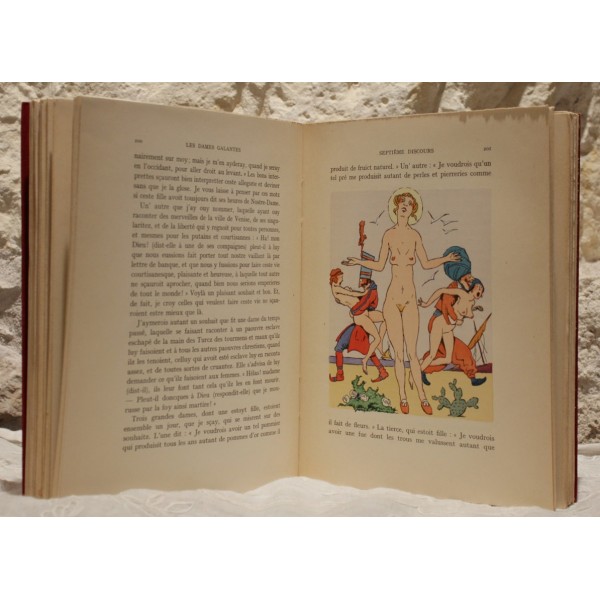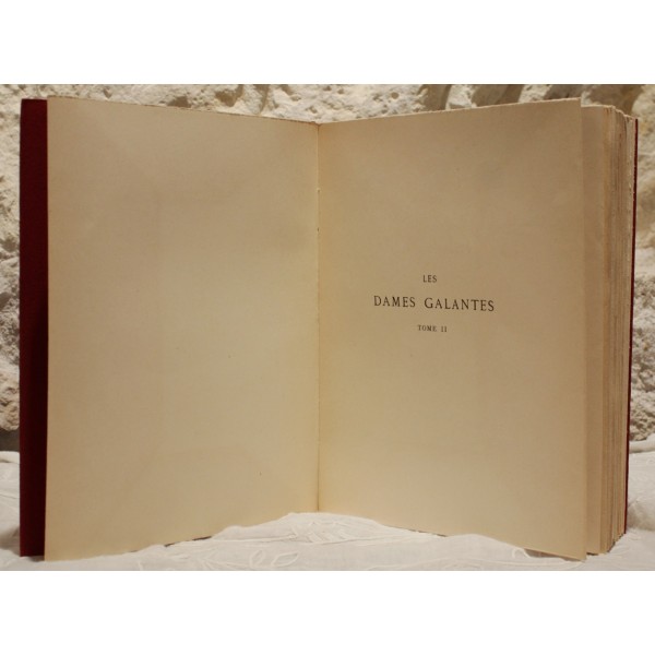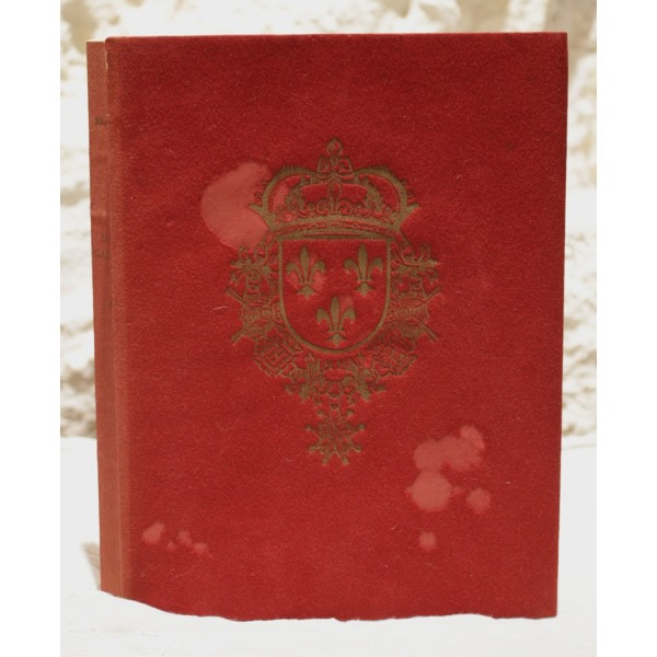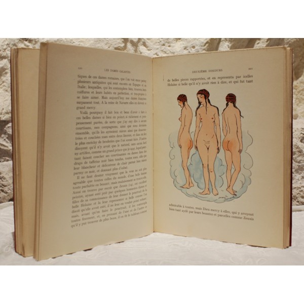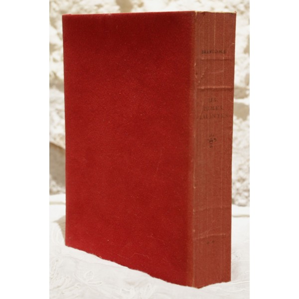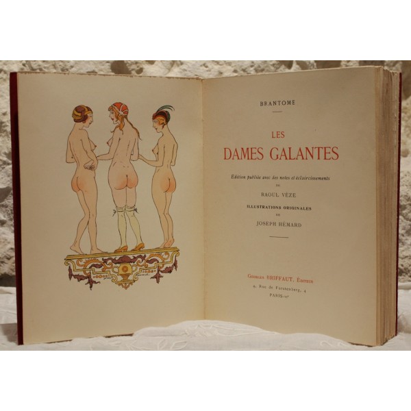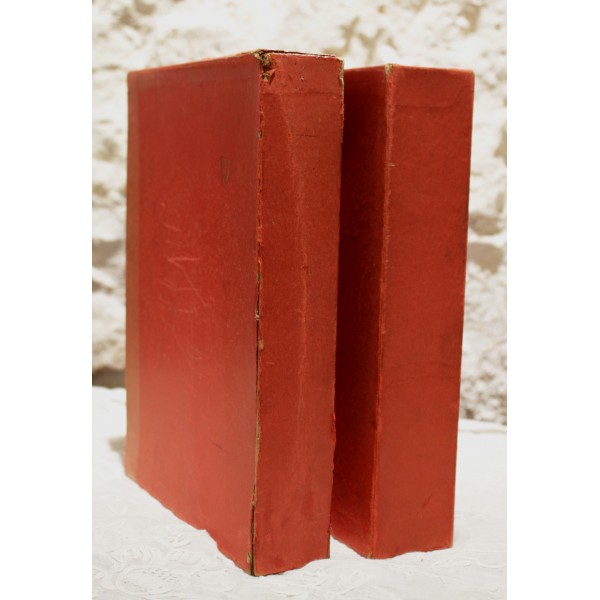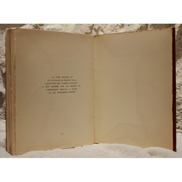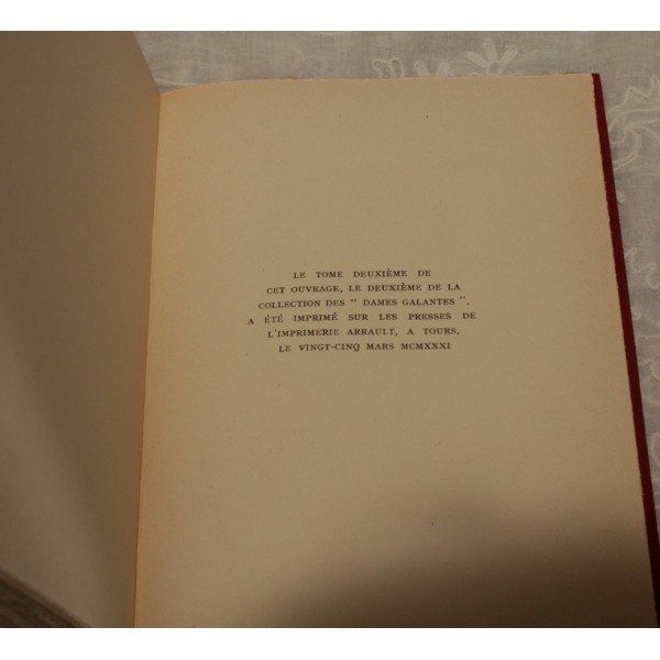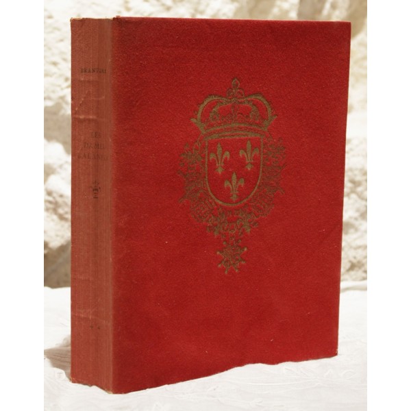 Livre "Les Dames Galantes" de Brantôme en deux tomes, sous boîtages. Illustrés par Joseph Hémard, édités par Georges Briffaut et imprimé à Tours par Arrault. Reliure en velours rouge aux armes de France. Exemplaire 592/1500. Tome 1 : 308 pages, Tome 2 : 372 pages