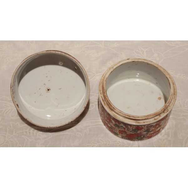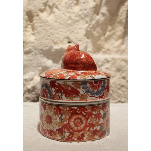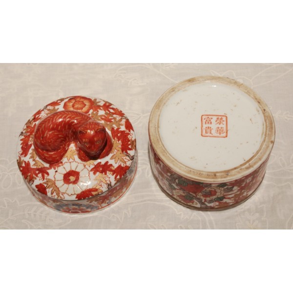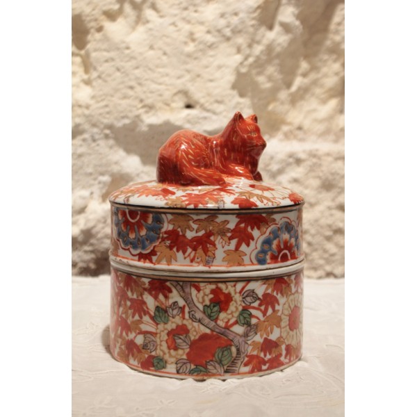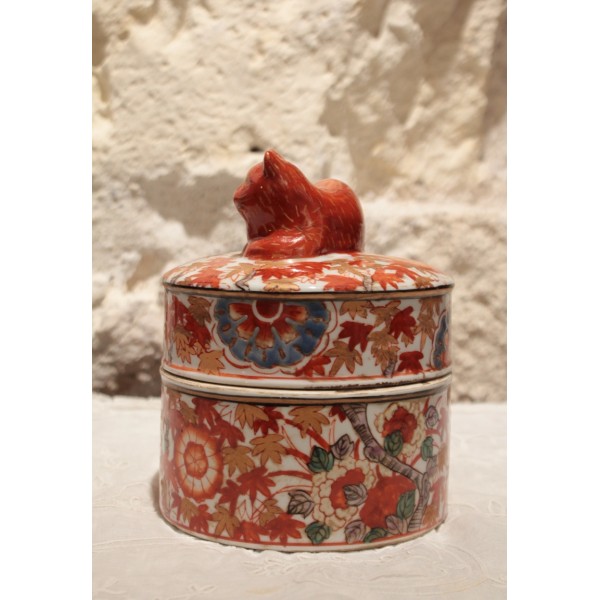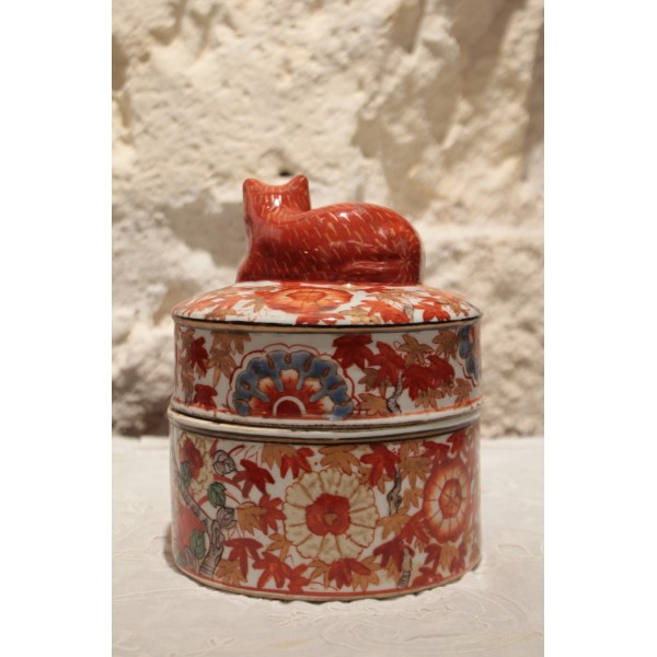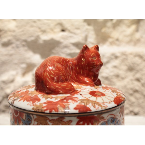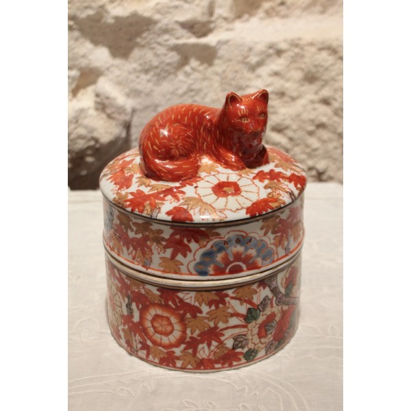 Boîte ronde en faïence de style Imari, décorée de motifs floraux et feuillagés en rouge, bleu et rehauts d'or, surmontée d’un chat couché formant la prise du couvercle. Marque sur l'envers. Bon état général.