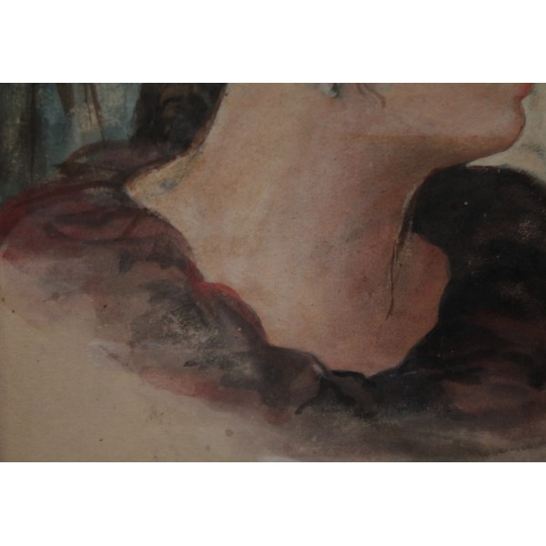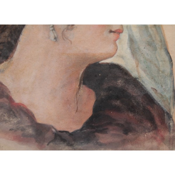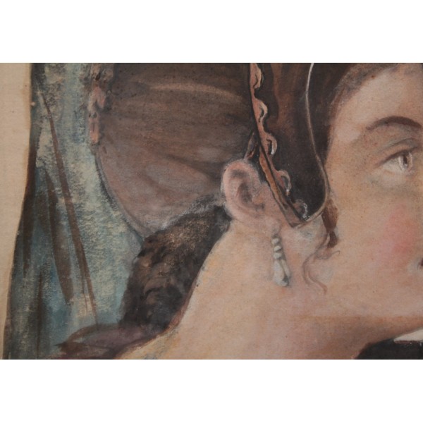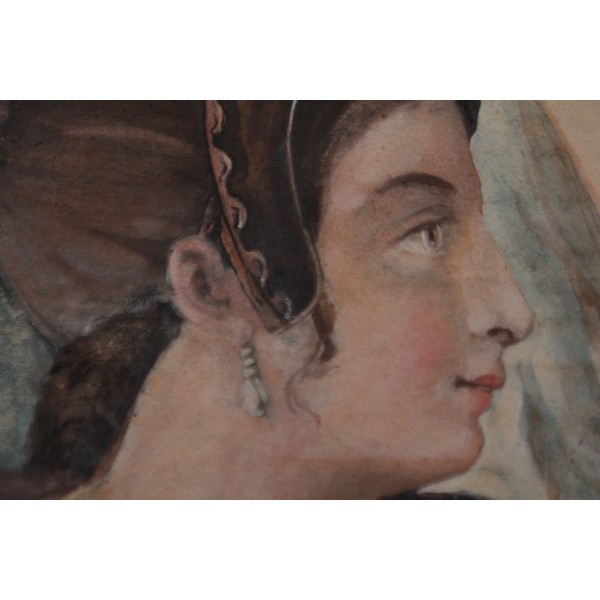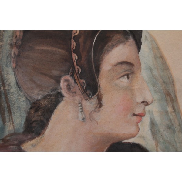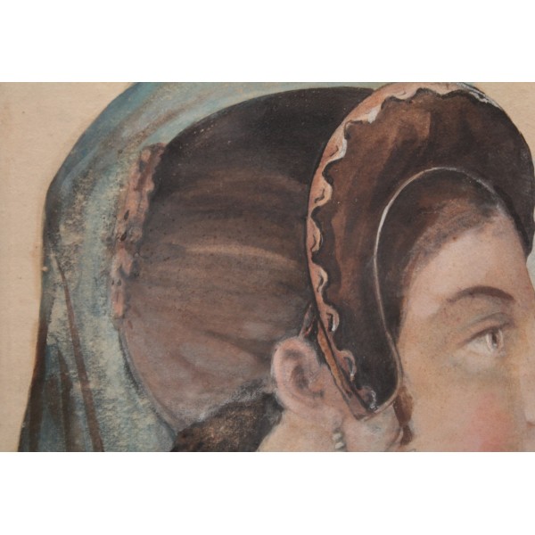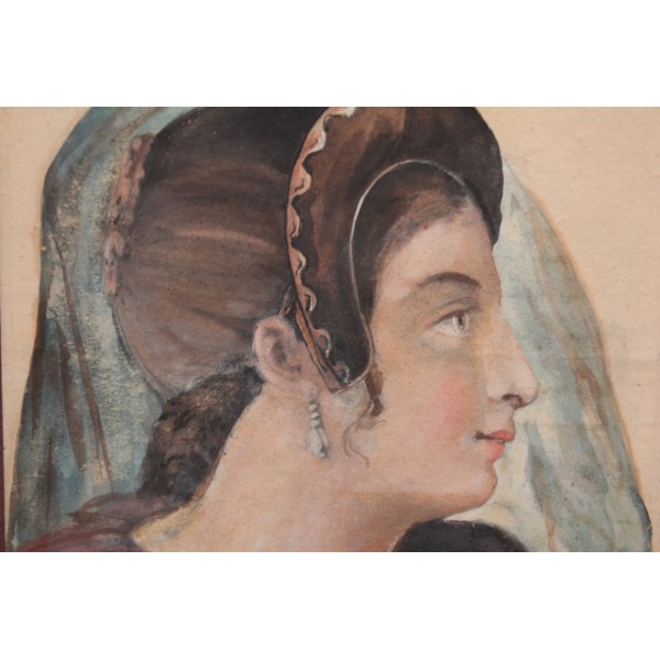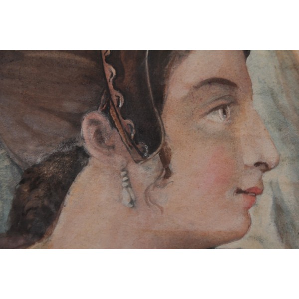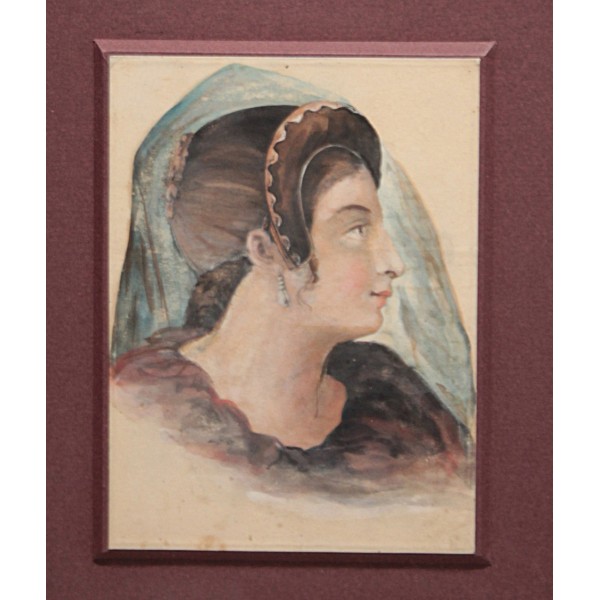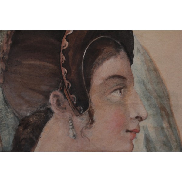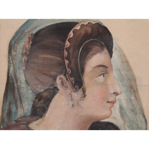Aquarelle encadrée représentant un portrait de femme de profil, parée d'une coiffe et portant une boucle d'oreille en perle. Probablement une étude d'après une oeuvre, s'inspirant du médiéval rêvé du 19ème siècle. Encadrement en l'état, Napoléon III.