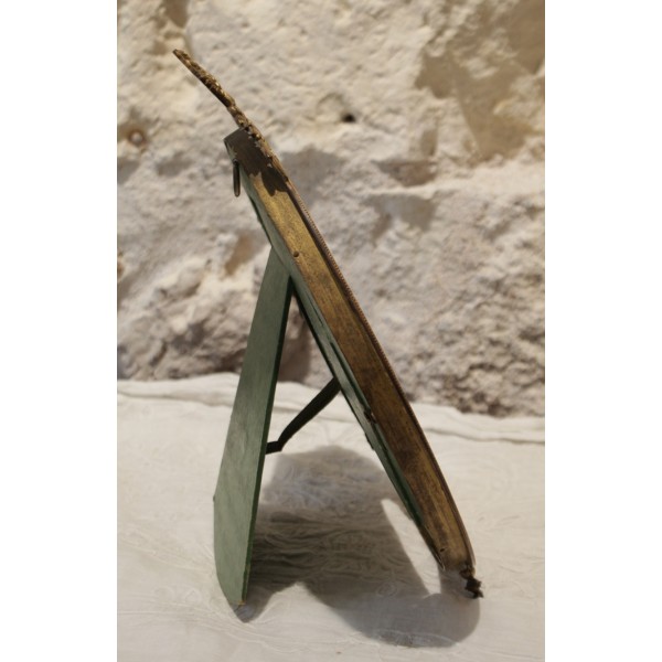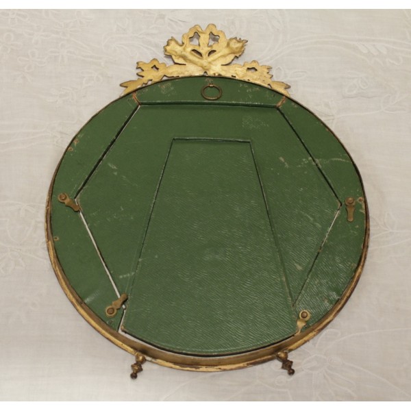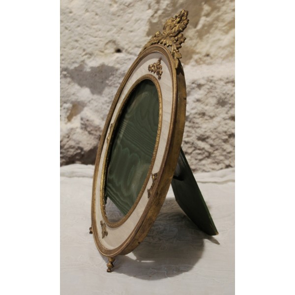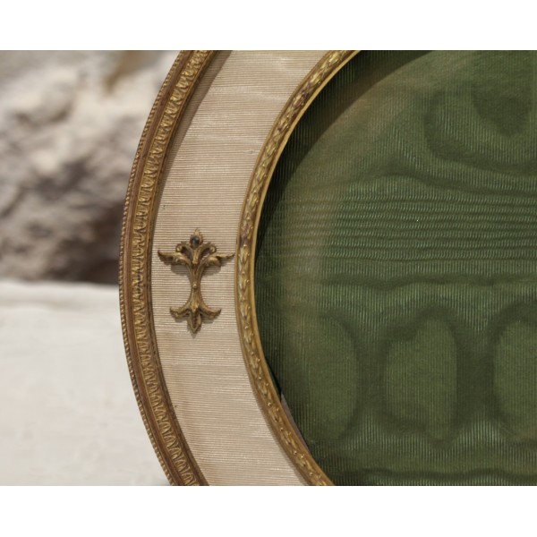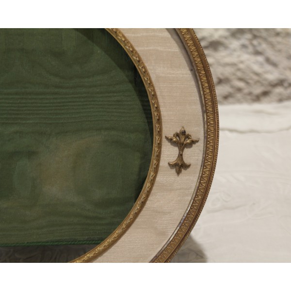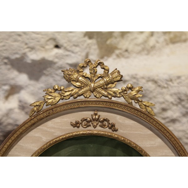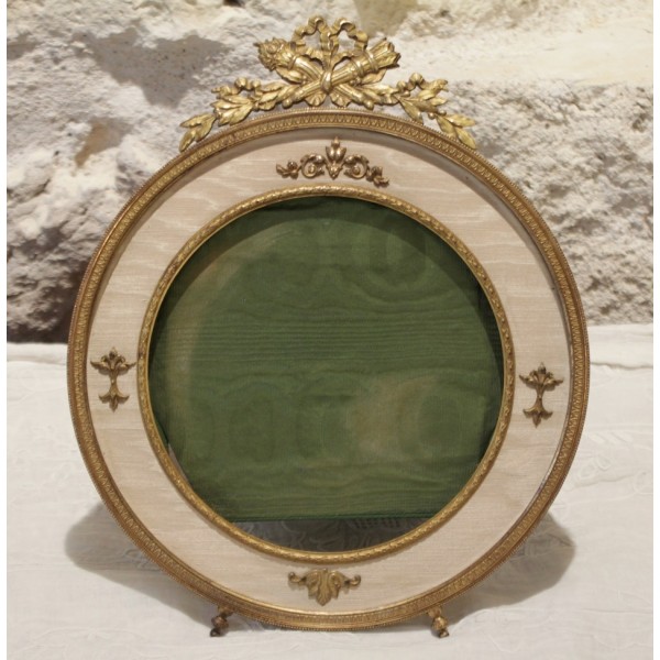 Grand cadre circulaire en bronze et laiton surmonté de carquois, fleurs et rubans. Tissu beige moiré et éléments en bronze doré. Piétement toupies permettant de poser le cadre. Dos en carton vert et anneau de suspension. Bon état général, prévoir une adaptation pour la pièce à encadrer.