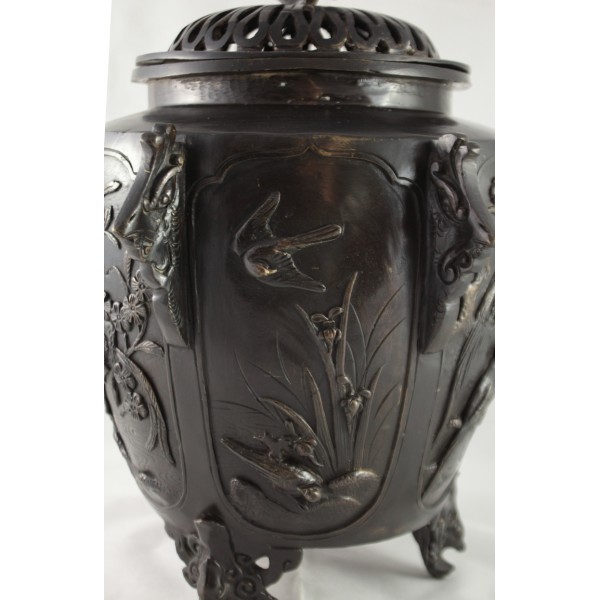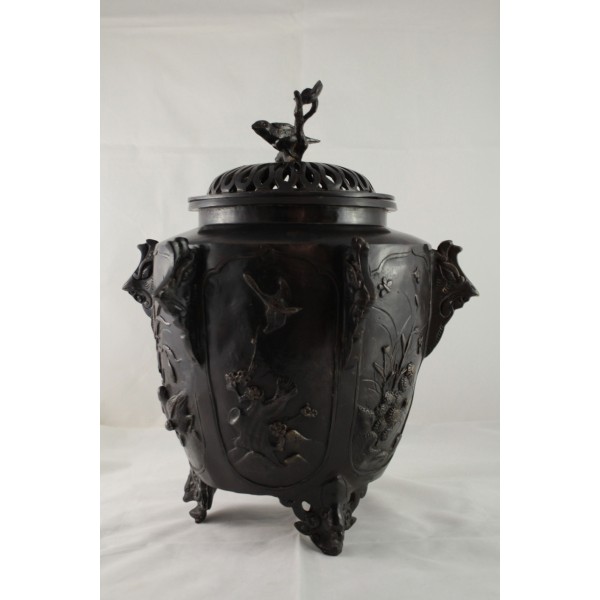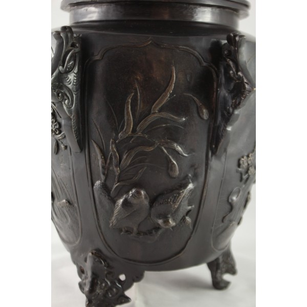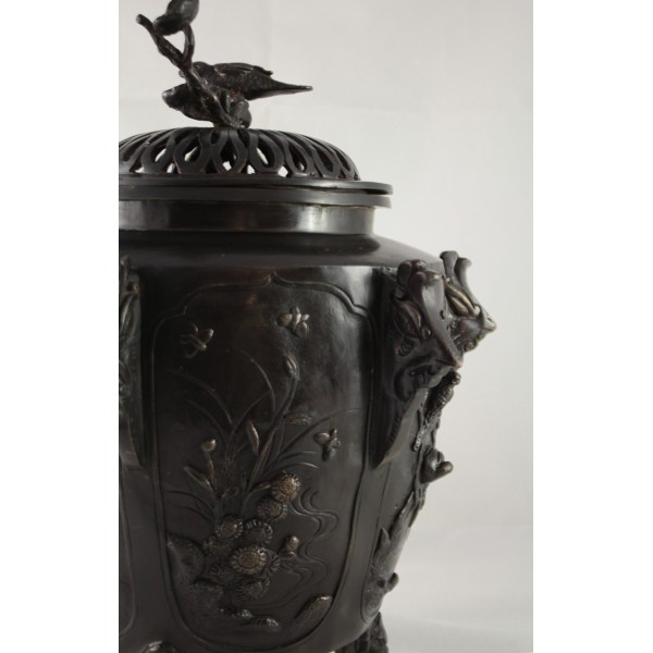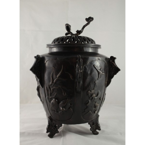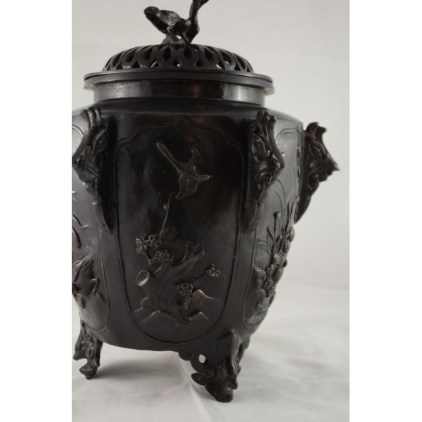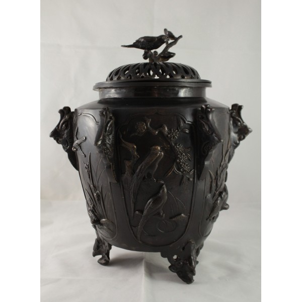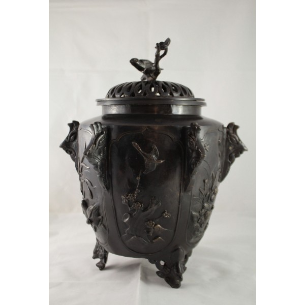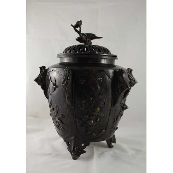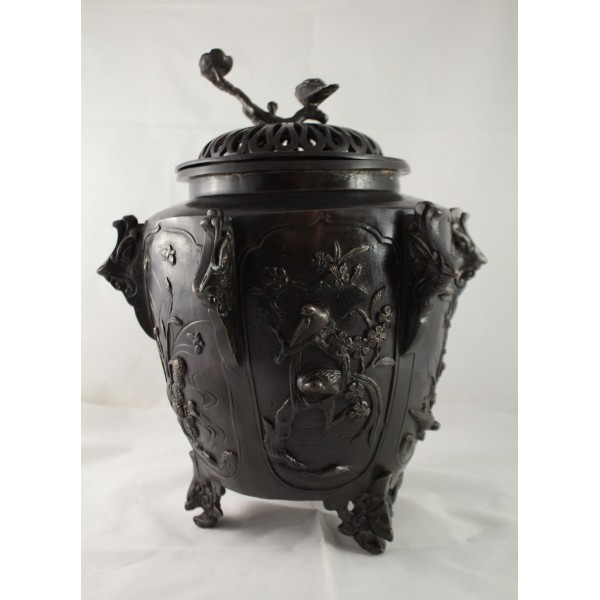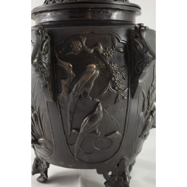 Grand pot couvert, brûle-parfum, en bronze à patine brune reposant sur 3 pieds. La panse est décorée aux 6 faces aux décors d'oiseaux, de fleurs et de végétations avec alternance d'éléments stylisés. Bon état général, à signaler une rayure de la patine.