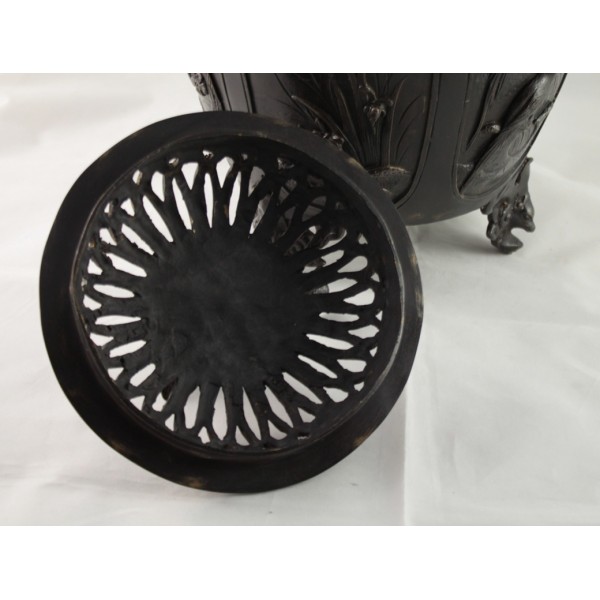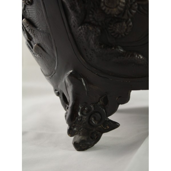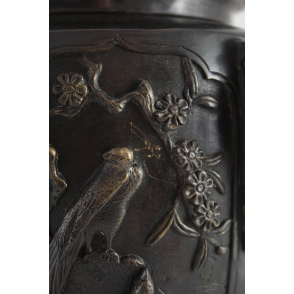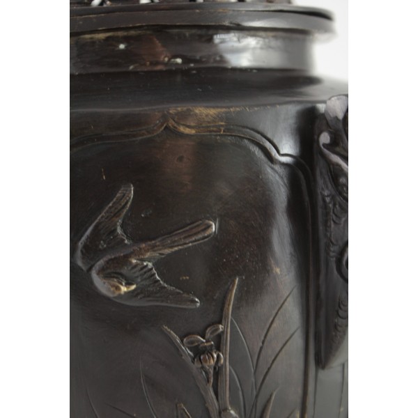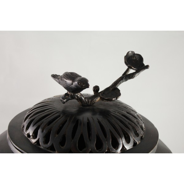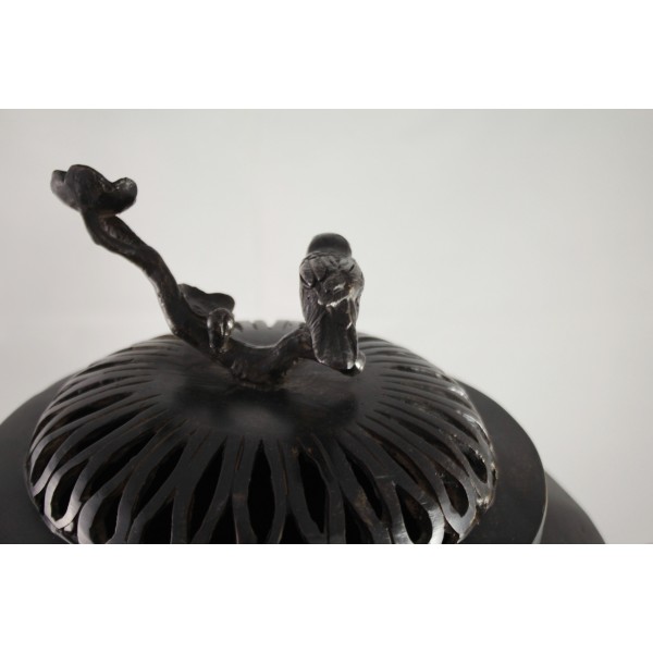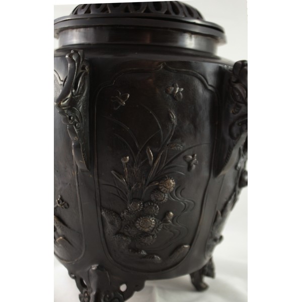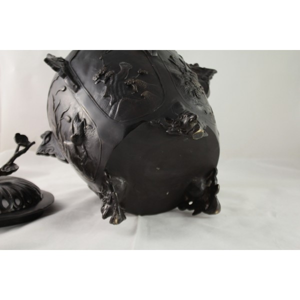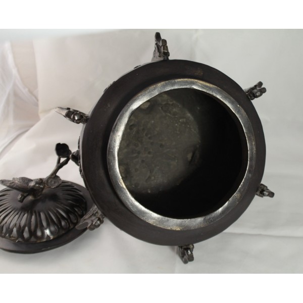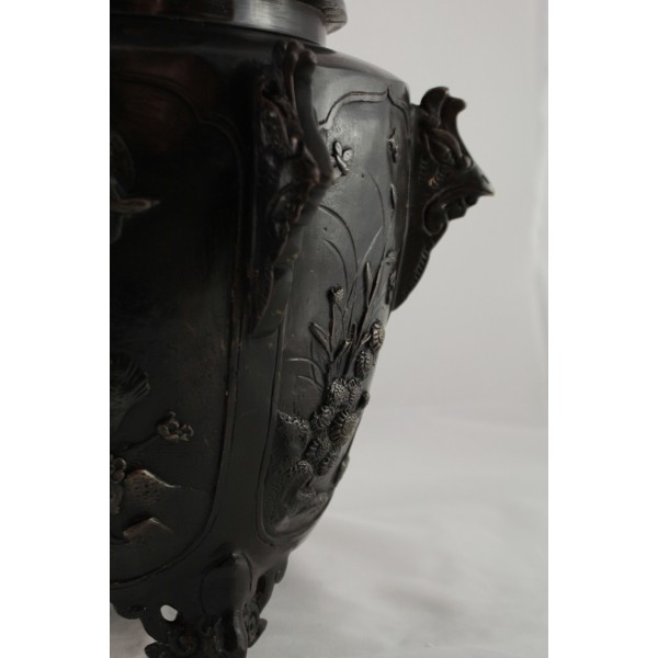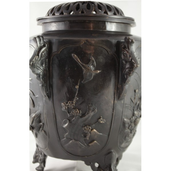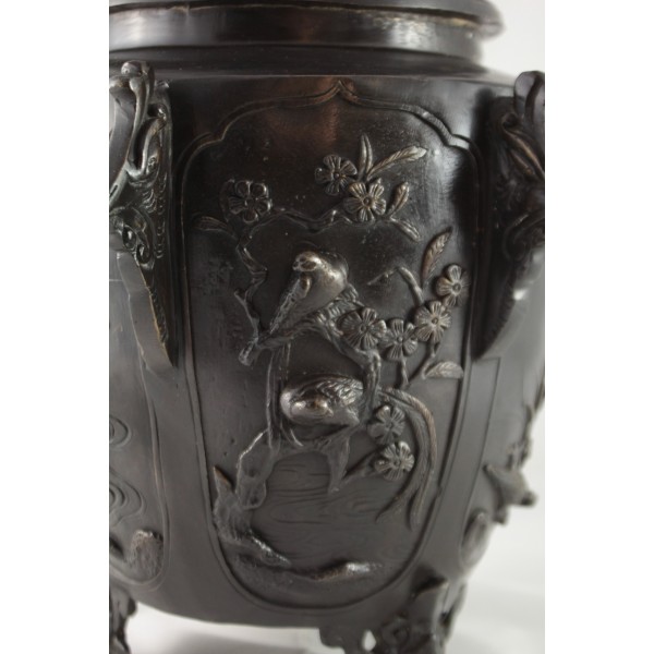 Grand pot couvert, brûle-parfum, en bronze à patine brune reposant sur 3 pieds. La panse est décorée aux 6 faces aux décors d'oiseaux, de fleurs et de végétations avec alternance d'éléments stylisés. Bon état général, à signaler une rayure de la patine.
