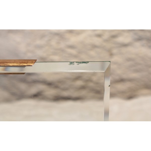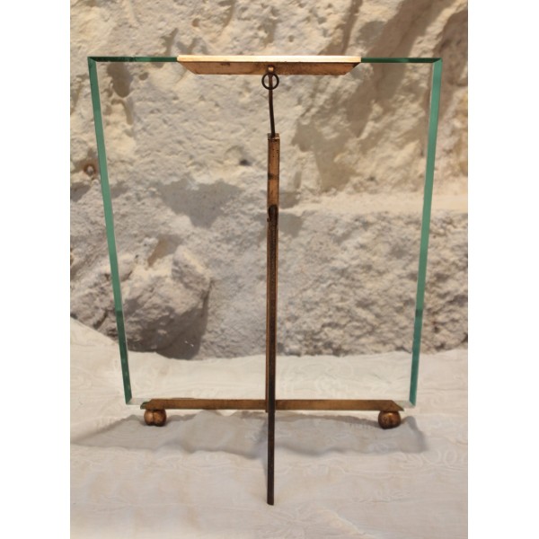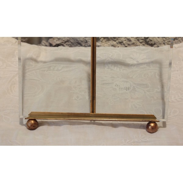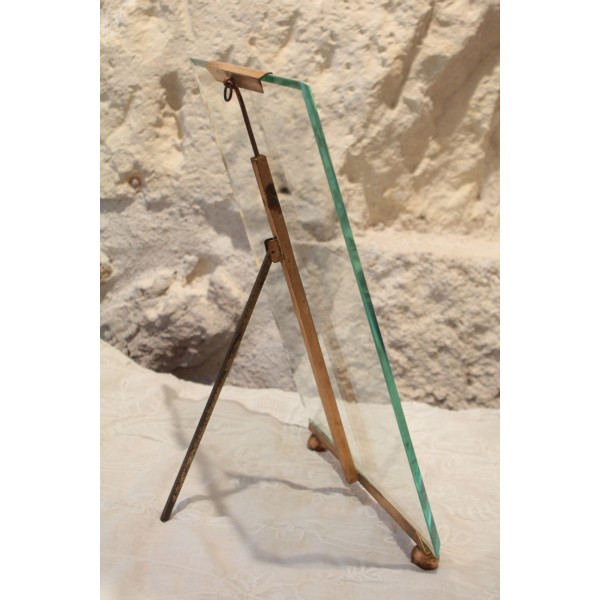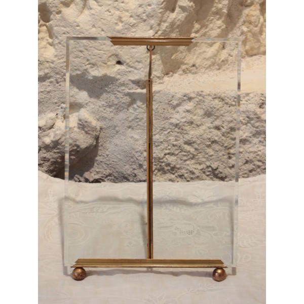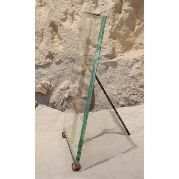 Grand cadre en verre biseauté avec système et piétement boule en laiton. Bon état général, à signaler un infime éclat sur le coin supérieur droit du verre.