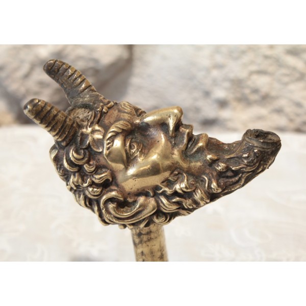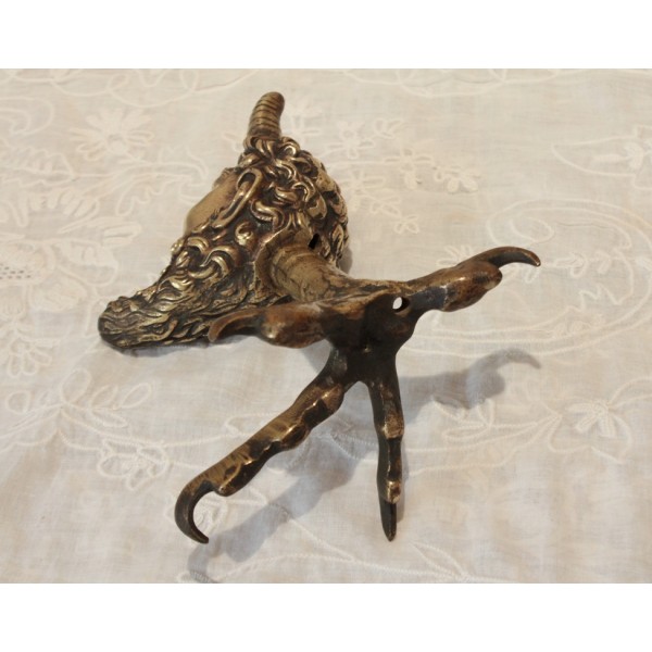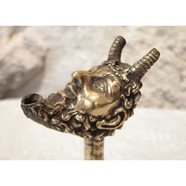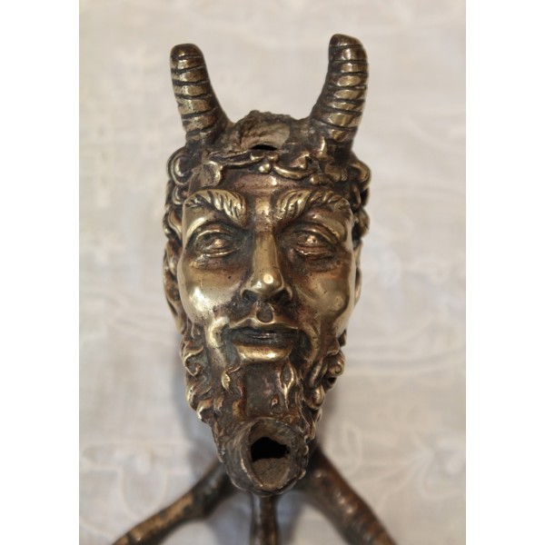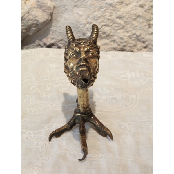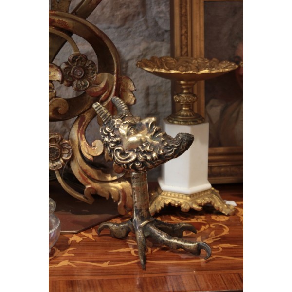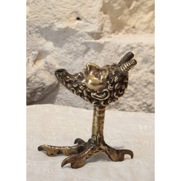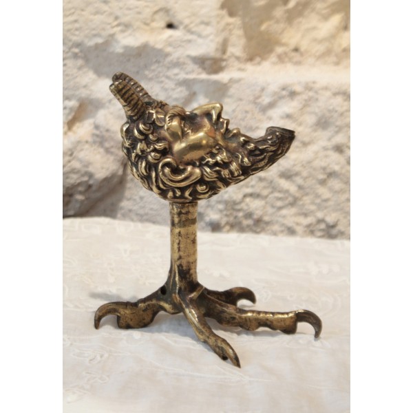 Étonnante sculpture en bronze doré, autrefois lampe à huile, représentant une tête de faune reposant sur une patte d'oiseau, probablement un gallinacé.