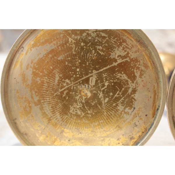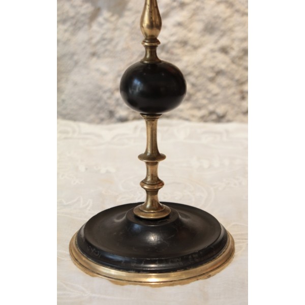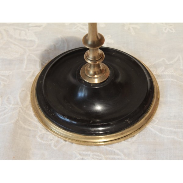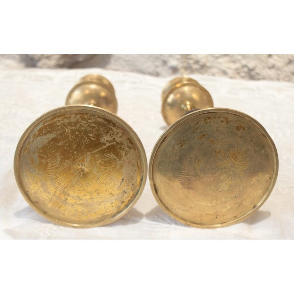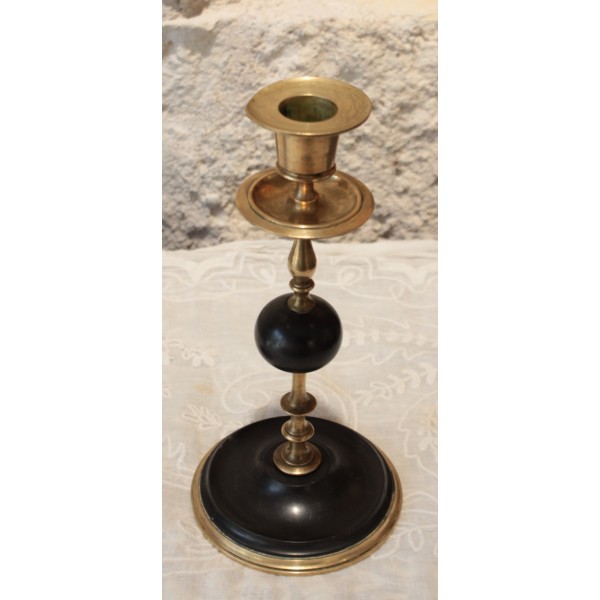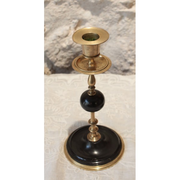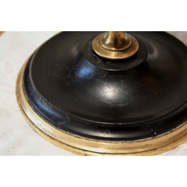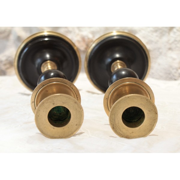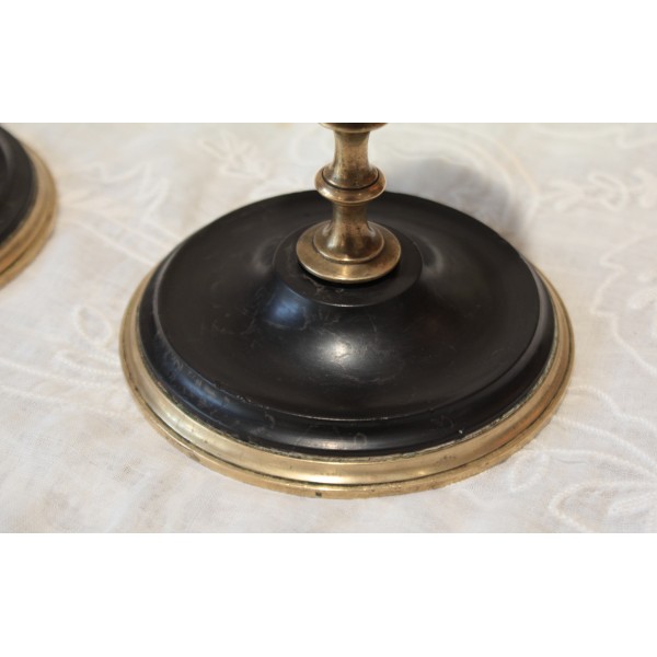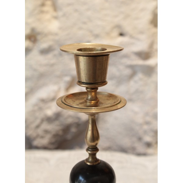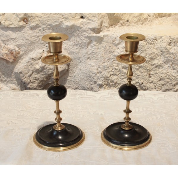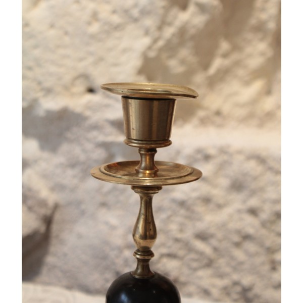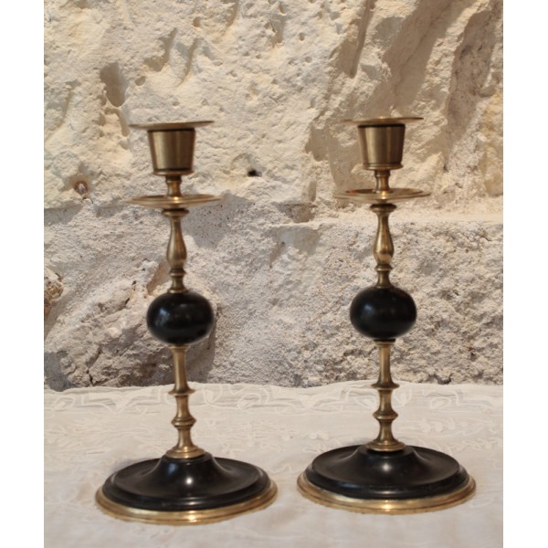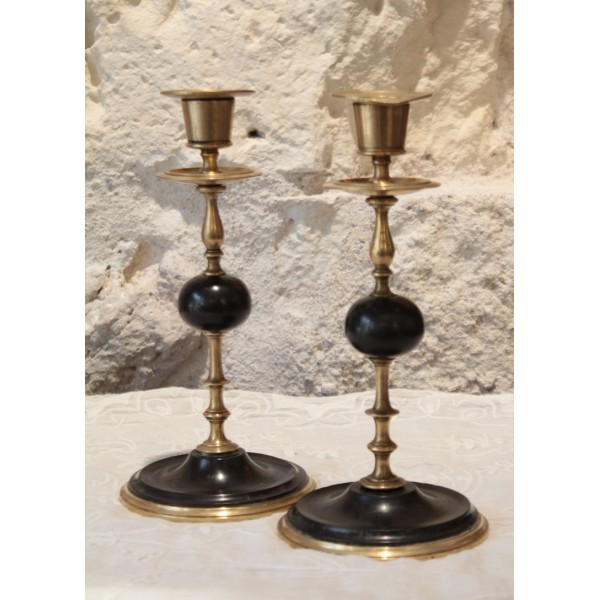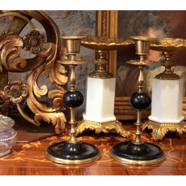 Paire de bougeoir en laiton doré et éléments en marbre noir : socle et sphère. Inscription au revers "JJJ". À signaler une déformation à une bobèche et frottements sur la base en marbre d'un des bougeoirs.